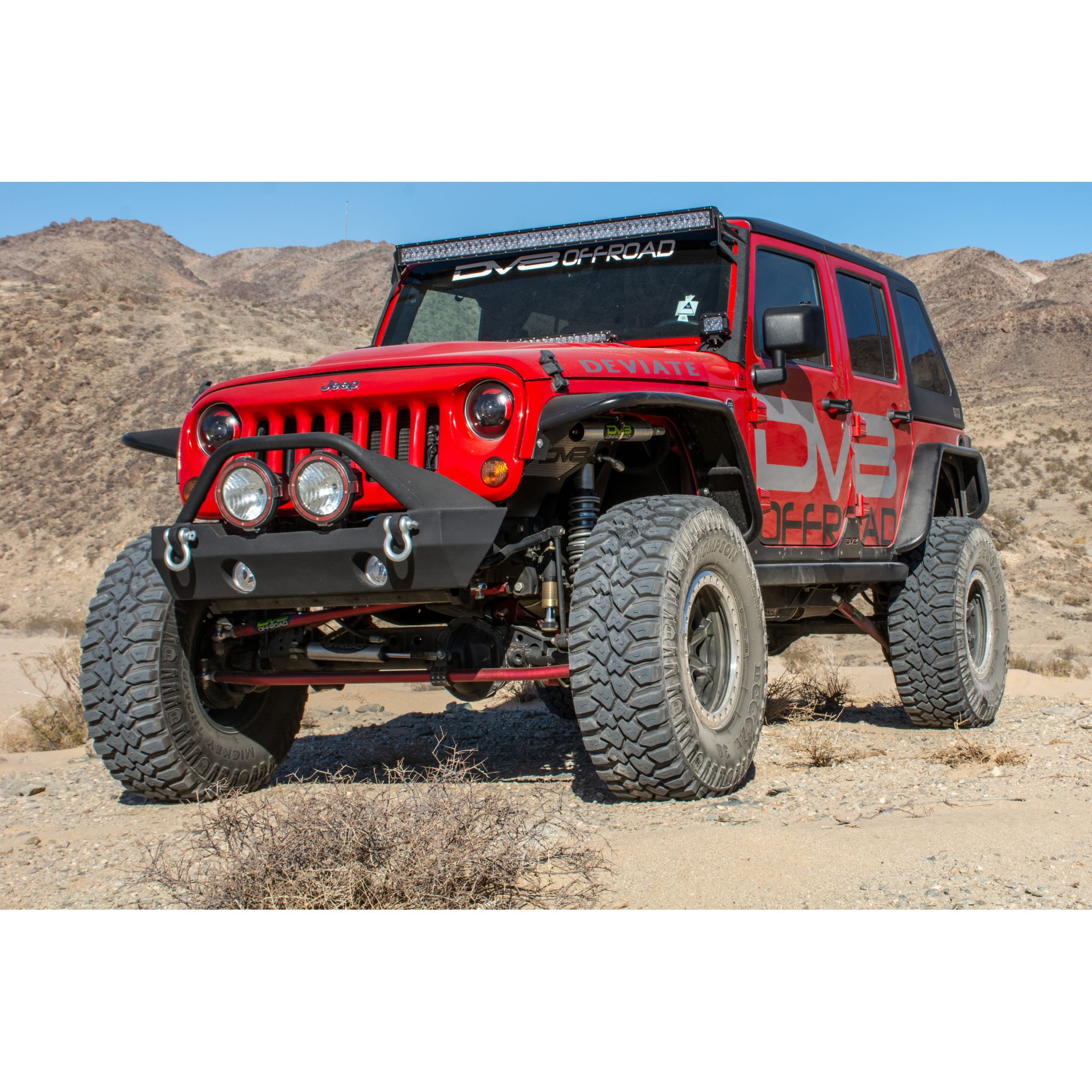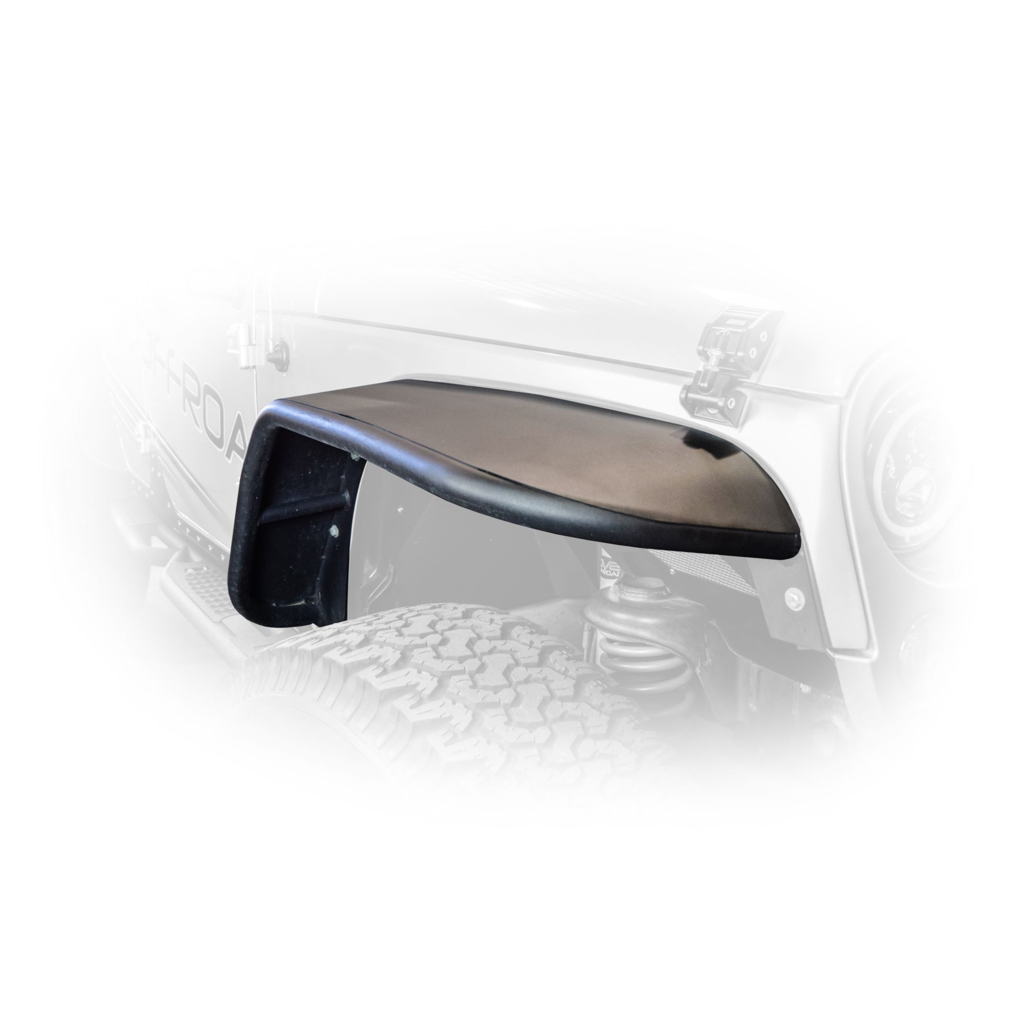 DV8 Offroad Flat Fenders provide more tire clearance and more ability to flex. They come with internal bracing to ensure strength and durability. Our fenders come in a gloss black color and can be painted to match or left as is. They line up perfectly with the JK body lines and installation is extremely simple with precision cut holes to match the factory fender holes. DV8 fenders also come with our exclusive turn signal mounting bracket, which can be used to mount an aftermarket turn signal light. Ditch the factory plastic fenders which leave your JK vulnerable to expensive body damage, and upgrade to DV8 steel fenders. The Second Gen Fenders Include: Front and Rear Flat Fenders (4) Flat Fenders w/ thick tubing and rigid steel plating, 4 Rubber guards to keep the fenders from rubbing on the Jeep's body. Stainless steel mounting hardware. The 2nd gen fenders are wider than the 1st gen to help keep the Jeep street legal. Also included is a bracket for placing a turn signal indicator (sold separately) into the fender well. Fits 2007-2018 Jeep JK Wrangler. Sold as Set.