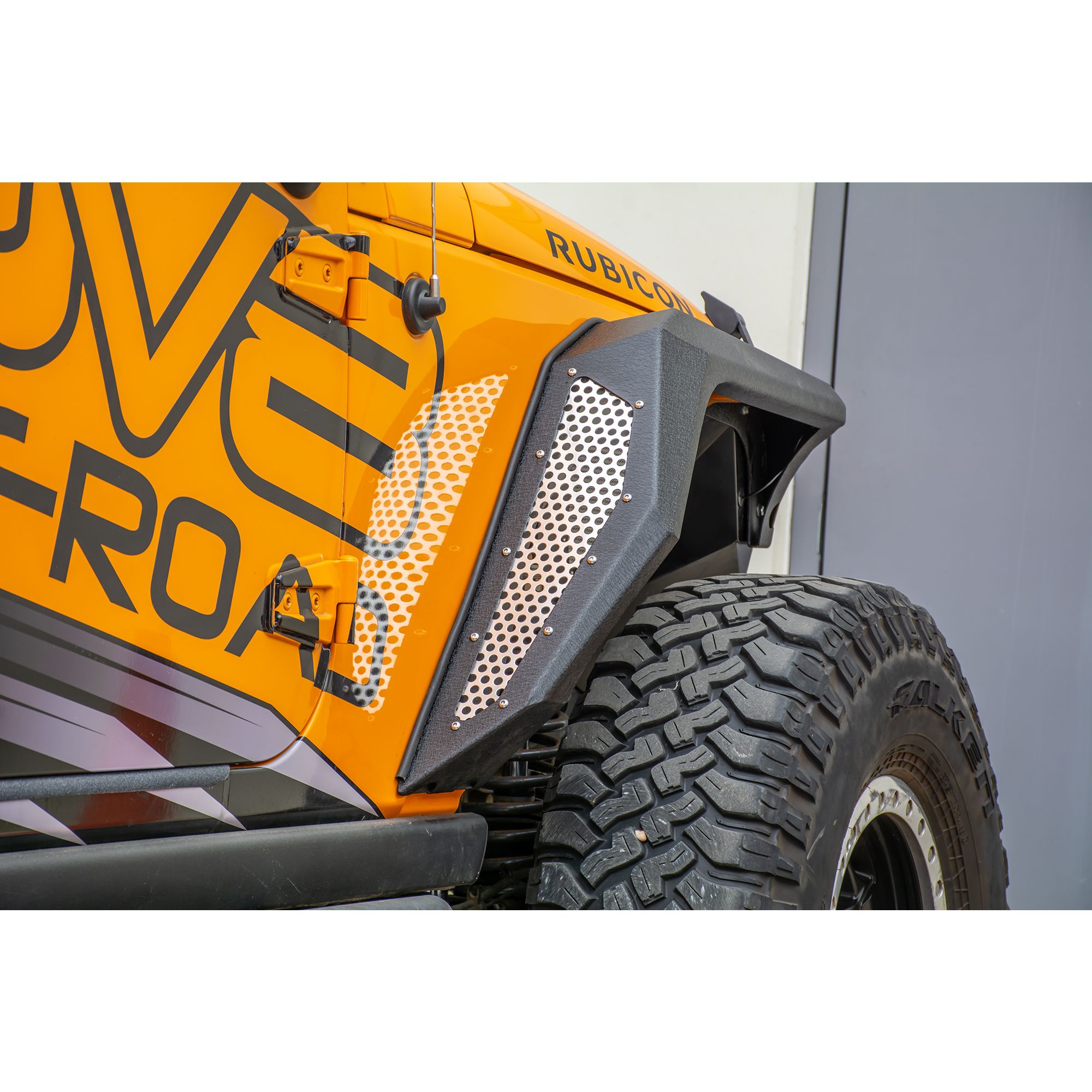 Jeep JK Bolt On Armor Style Fenders Front and Rear (2 Door and 4 Door) The FENDB-09 Jeep JK Armor Style Fenders are the ultimate bolt on armor fender. These fenders are easy to install and feature mesh aluminum accents, tight and functional design, and are 100 percent bolt on. Available for the 2 door or 4 door JK DV8 has run these fenders through countless trails and off-road miles and they truly rise to any off-road challenge. Details: Front and rear fenders, Bolt on design, Textured powdercoat, Slim design, Excellent tire clearance.