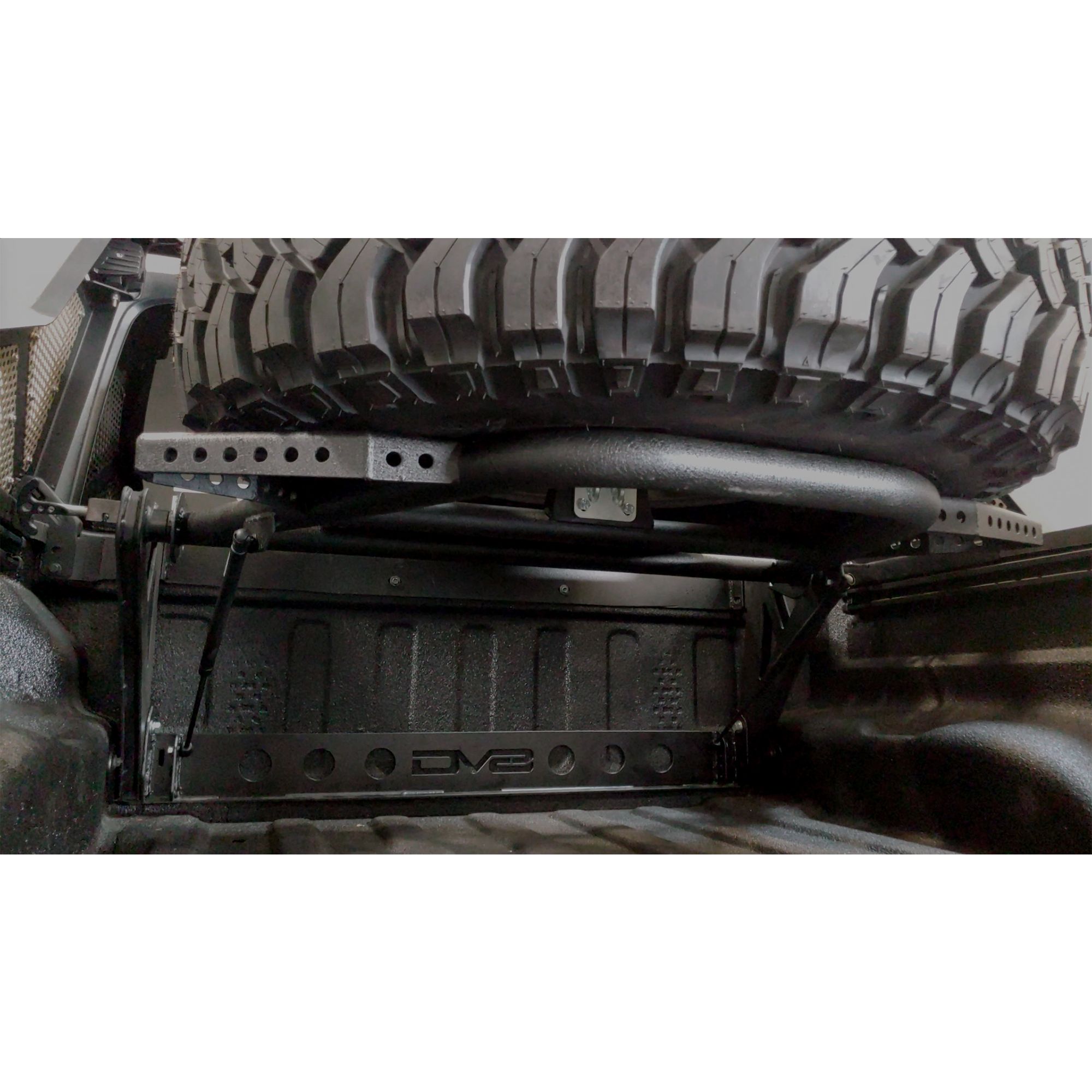The DV8 Offroad TCGL-01 relocates the spare tire to the bed of your Gladiator with no drilling into the bed required. This carrier mounts to existing locations and is rigid enough to support up to a 42 inch tire. The carrier also allows for 2 easily adjustable tire positions, the first places the tire at a 45 degree angle, the second puts the tire parallel to the bed and allows use of the area underneath it to haul extra cargo or gear. The carrier is rigid enough to support the tire in either position while on or off road. It also comes with 2 HD gas shocks which make raising and lowering the tire a breeze. Features: Adjustable tire carrier with 2 mounting positions, Gas shocks to assist with moving the spare, Universal mount design allows for virtually any bolt pattern or center bore, Easy install with no drilling required.