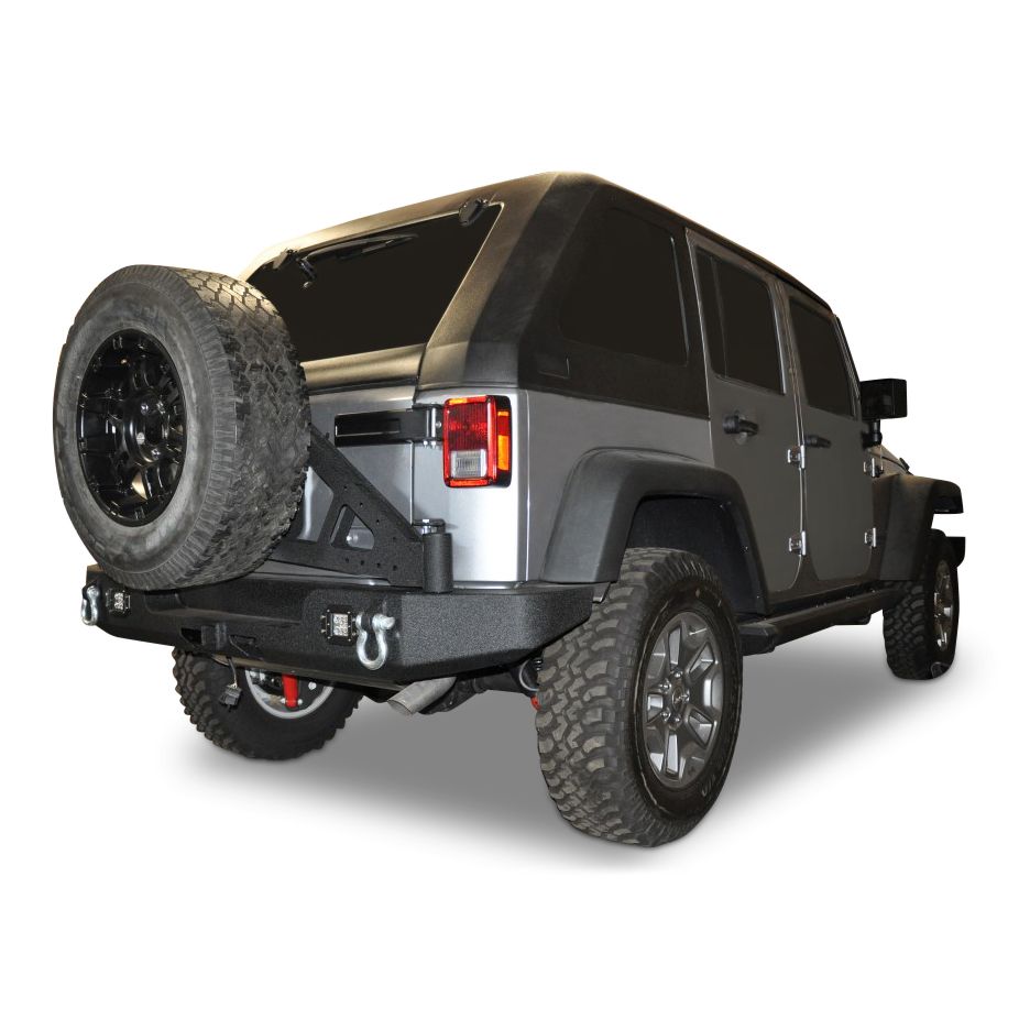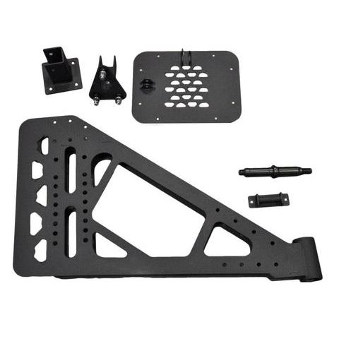 The TC-6 is a tire carrier that extends from the bumper (RS-10 and RS-11) to the Jeep's rear tailgate. Much like the DV8 RS-2 it opens along with the tailgate in 1 step rather than the 2 step process of opening a standard swing away tire carrier. This carrier is designed to bolt onto your existing RS-10 or 11 bumper so that if you are on a budget you can purchase the bumper and then the tire carrier. It is precisely CNC laser cut with a multitude of mounting points so that you can get creative with your hi-lift jack, gas and water cans, or whatever else you like to bring with you. After the laser cutter cuts the pieces it is then sent to be expertly welded and sent off to powder coat. The final product is a solid tire carrier that can handle the load of any Jeep adventure. Features: TC-6 Tire Carrier, Black, 2007-2018 Jeep JK Wrangler, Sold as a Kit. Note: This tire carrier attaches to the RS-10 and RS-11.