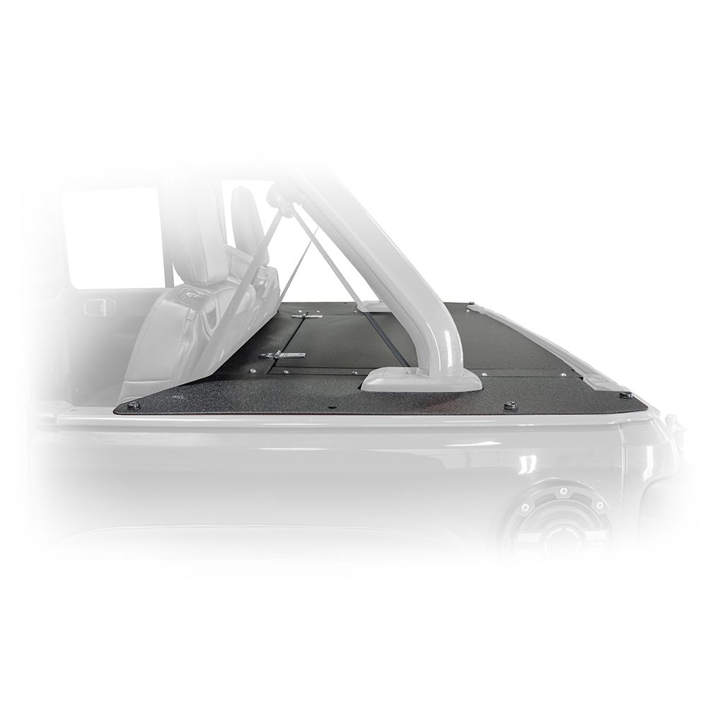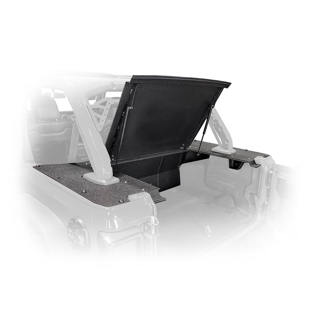 DV8's JLRS-01 rear locking storage offers security and protection when going topless. Made from 1/8 inch steel, our storage compartment offers access behind the rear seats by a small locking door and large open access from the rear of the Jeep. The JLRS-01 design will allow you to close the rear door of the Jeep and use your factory door locks to lock and secure the compartment. With a 150 lbs. rating, you can use the deck lid for storage as well! This is designed for the 4-Door applications only and can be used with or without the factory hardtop. Details: Gas shocks for lids, 1/8 inch Steel, Stainless Steel Hardware, 100 percent Bolt-on application, Standard DV8 Warranty.