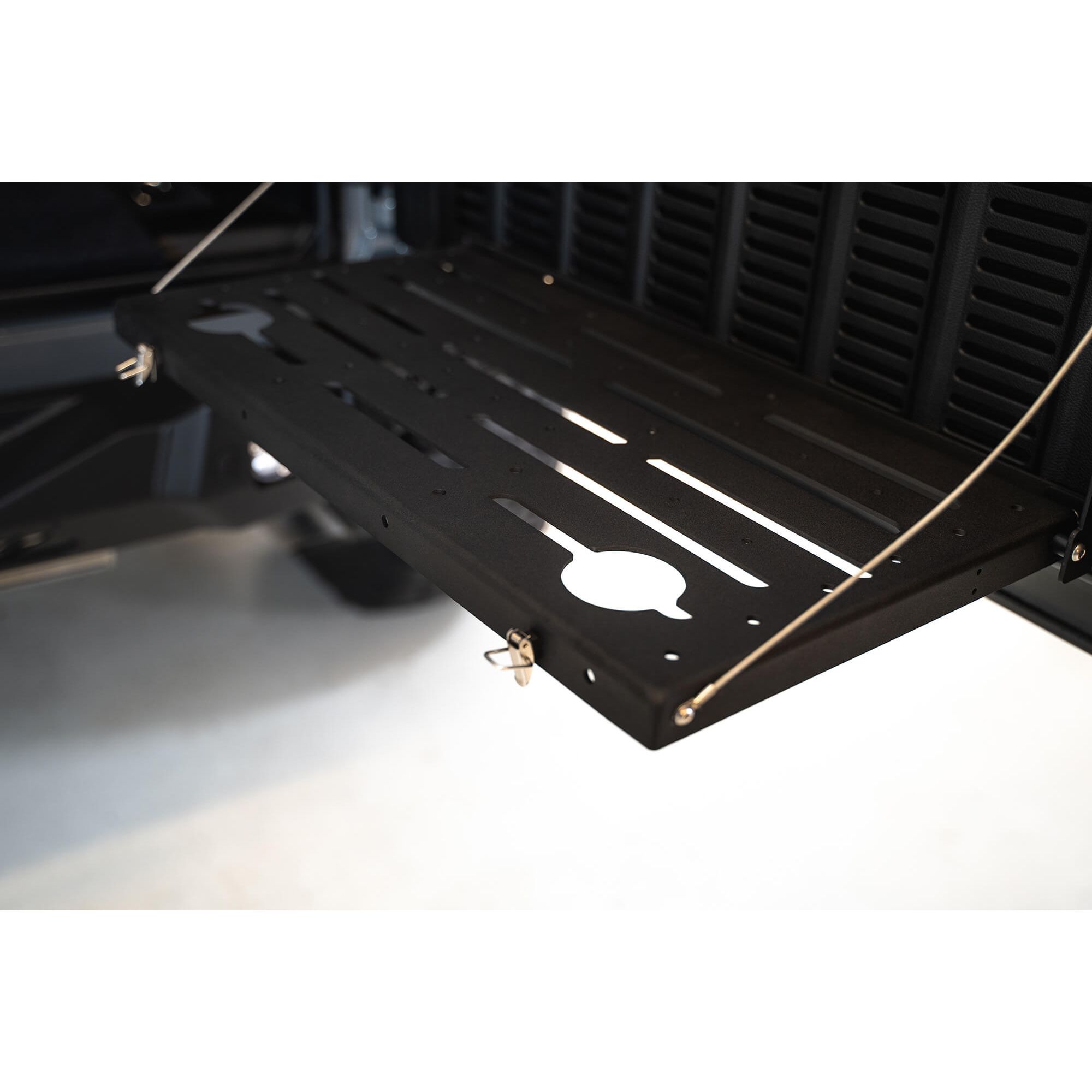DV8 Offroad Jeep JL Folding Trail Table. Constructed from solid steel and powder coated for protection. The DV8 TTJL-01 is a convenient table that folds down from the tailgate. Whether you are doing a trail repair or just making lunch, this table just makes life easier. Fold up design makes storage convenient. Can hold up to 100 lbs. Bolts to factory mounting points. Rattle free design.