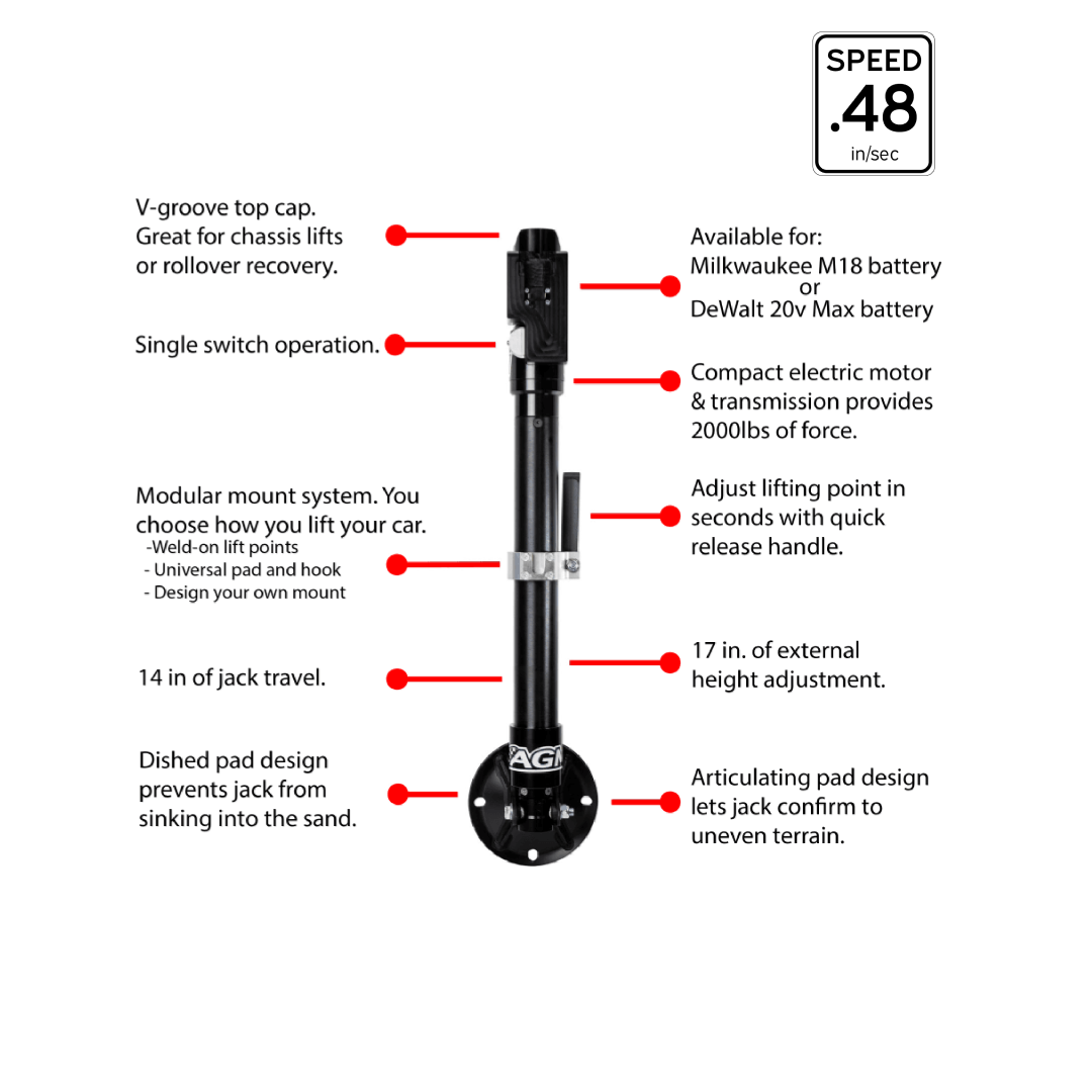 Compact and Portable: Weighing in at just 17 lbs and collapsing to a mere 35 3/4", the Electric Jack is a space-saving powerhouse. It's no-sink pad design ensures stability and safety during use. Battery Interface Options: Choose between Milwaukee, DeWalt, or Makita battery interfaces to suit your preferences and existing tools. Modular Mounting System: Customize your setup with ease. The Electric Jack features a modular mounting system, allowing you to use our lift adapters (Jack Points or Universal Hook) or create your own solution. Patented Innovation: The Electric Jack is backed by Patent No. 11,584,624, assuring you of its unique and cutting-edge design. Upgrade your lifting game with the Electric Jack and experience a new level of convenience and safety. Whether you're new to off-road or a professional, this tool will revolutionize the way you work. Don't wait to experience the future of lifting technology. Get yours now and discover the power of effortless lifting. SPECS: Capacity- 2000lbs, Collapsed Length- 35.75 in., External Height Adjustment-17in., Travel length- 14in., Weight- 17lbs. NOTE: Jack and components are sold "A La Carte", so you can build exactly what you want. Accessories are sold separately, including Batteries! This is a modular system so feel free to purchase the Weld-On Jack points or make your own attachment tool for the jack.