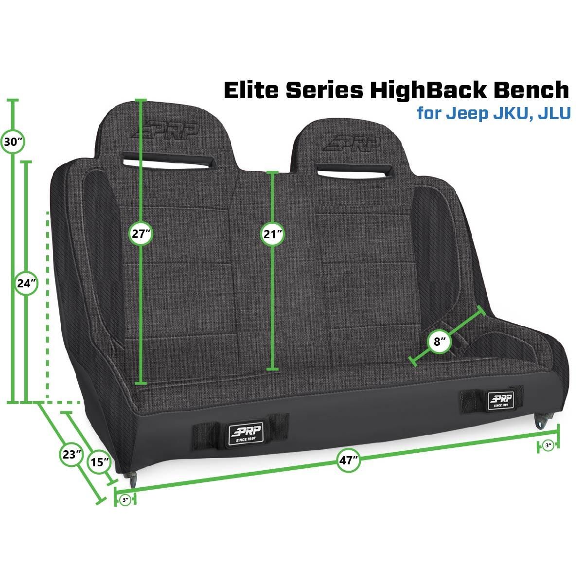 The Elite Series Bench features an all new look for more customization options and large harness openings allowing for a better fit and easier adjustment. Built for off-road, this bench provides better comfort and containment than stock. The styling of this Elite Series bench matches the styling of our other Elite Series seats, so you can match the exact look of your front seats. The bench can comfortably fit 2 adults, and is built 3" shorter than our standard seats to allow for more leg room (23" deep – front to back). Can be slotted for either 2 passengers, or 3 passengers (will only really fit 3 kids.) Design your own and Make it Yours! With over 60+ different colors and materials to choose from, you can customize the perfect seat for your ride. Extra options available include Front Goggle Pockets, Rear Storage Pockets, Water Paks, Heated Seats, Air Lumbar, and various Diamond Stitches. Built at 47" width to fit into Jeep Wrangler JKU ot JLU. Attach to your vehicle with PRP’s JKU/JLU Rear Seat Mount FEATURES Fits in the back of your Jeep Wrangler JKU (2007-2018) or Jeep Wrangler JLU (2018+) Measures 47” wide Mounting Area: 41? Wide x 15? Front to Back 31? Tall X 23? Deep (3? Shorter for more legroom) This high-back version features two headrests with large harness slots.