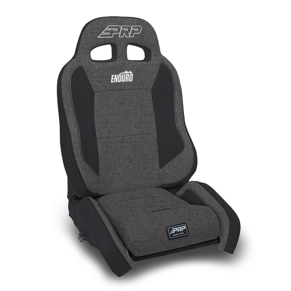 Add comfort and containment to your Jeep, Truck, or Buggy with the EnduroCrawl Reclining Suspension Seat from the Enduro Elite Series, the newest line of Reclining Suspension Seats from PRP. Featuring updated styling and a dual slot headrest for harnesses, the EnduroCrawl is designed to replace stock seats in a Jeep Wrangler, Jeep XJ, Ford Ranger, Trucks, or Buggy for a significant improvement to your enjoyment, comfort, and containment off-road. Featuring medium bolsters on the bottom and back of the seat, the EnduroCrawl provides the most containment for serious off-roading while retaining the ability to recline the seat. The bottom features higher sides to keep your legs locked in when bouncing around and the back lower section features a medium bolster at your sides that help to keep you secure. While the wider top section opens up, making it more comfortable for larger riders or those with broad shoulders. A removable, dual-layered seat cushion means the EnduroCrawl offers better leg support and extended comfort. The vinyl-coated nylon suspension liner and dual-density foam decrease the impact on the body and reduce body fatigue after a long day in the dirt or dunes. EnduoCrawl Reclining Suspension Seat is great for serious off-roaders who want to be held tight on the trails, with the additional comfort and adjustability of a reclining suspension seat. The EnduroCrawl reclines completely and inclines forward enough for access to the rear seats. The bottom tabs easily bolt to PRP’s series of mounts for Jeeps, Broncos, Ford Rangers, and more. The seat features Tweed Center, Vinyl Back and Vinyl Bands.