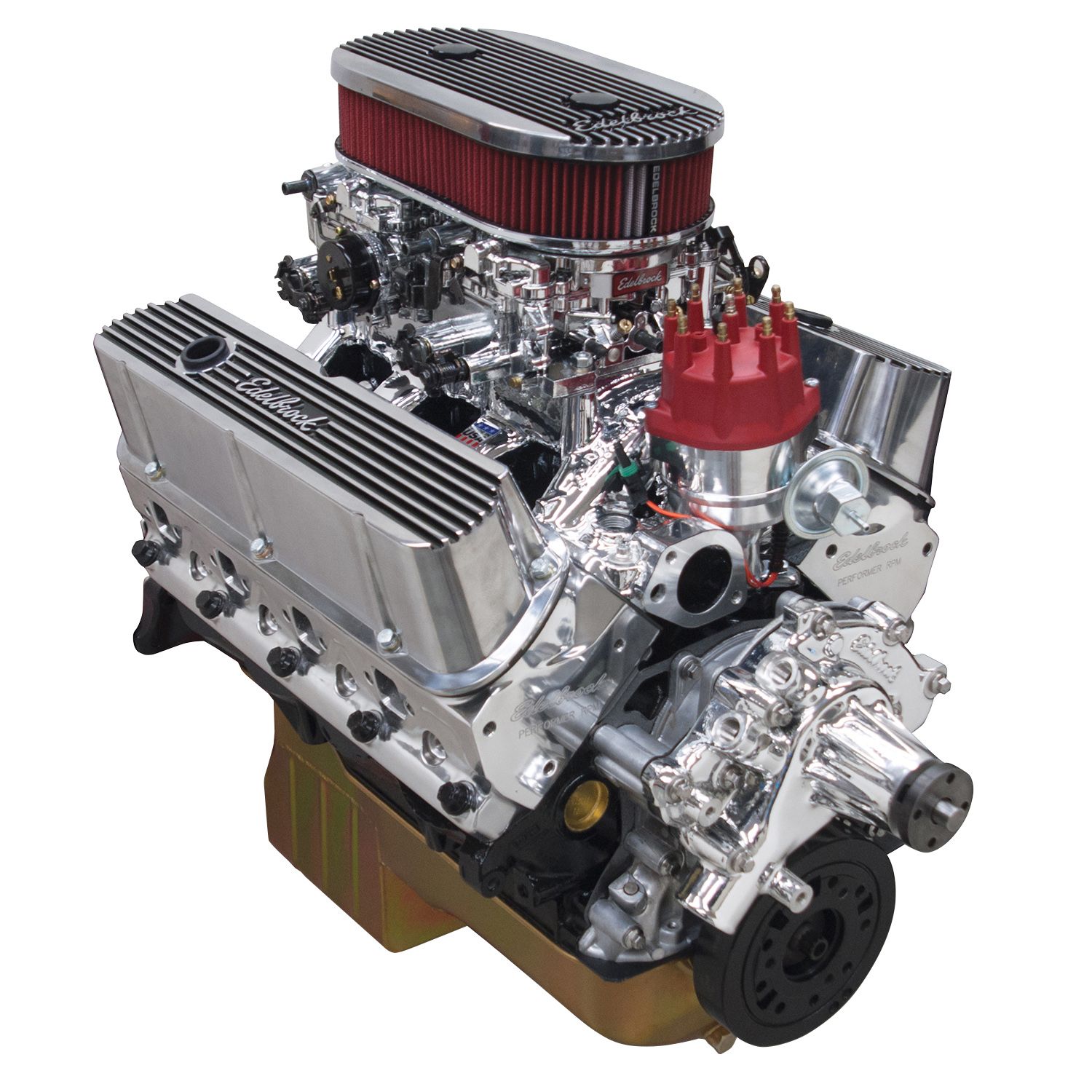 Edelbrock part #45474 Performer RPM Dual-Quad small-block Ford 347 crate engine offers the best of quality and performance with 438 HP & 413 ft/lbs. of torque right out of the crate. This 347 engine combines a Dart cast iron 4 bolt main block and a forged Scat rotating assembly which is then paired with our proven Edelbrock Power Package parts. This Performer RPM 347 engine includes a Milodon oil pan and pickup designed for use with 1974 and later applications as well as street rods that require a rear sump to clear the crossmember and/or suspension. Engine Specifications: – Finish: EnduraShine – Displacement: 347 c.i.d. (4.030" bore x 3.400" stroke) – Horsepower: 438 hp – Torque: 413 ft-lbs. – Compression: 9.5:1 – Block: Small-block (8.2" deck height) – Crankshaft: Forged Steel – Pistons: Forged – Camshaft: Rollin' Thunder Hydraulic Roller #2281 – Rocker Arms: 1.6:1 Roller #77780 – Manifold: RPM Air-Gap Dual-Quad #75354 – Cylinder Heads: Performer RPM #602515 – Carburetor: Thunder Series AVS – Water Pump: Victor series aluminum #88414 – Distributor: Included – Valve Covers: Elite II – Warranty: 2-year / Unlimited mileage