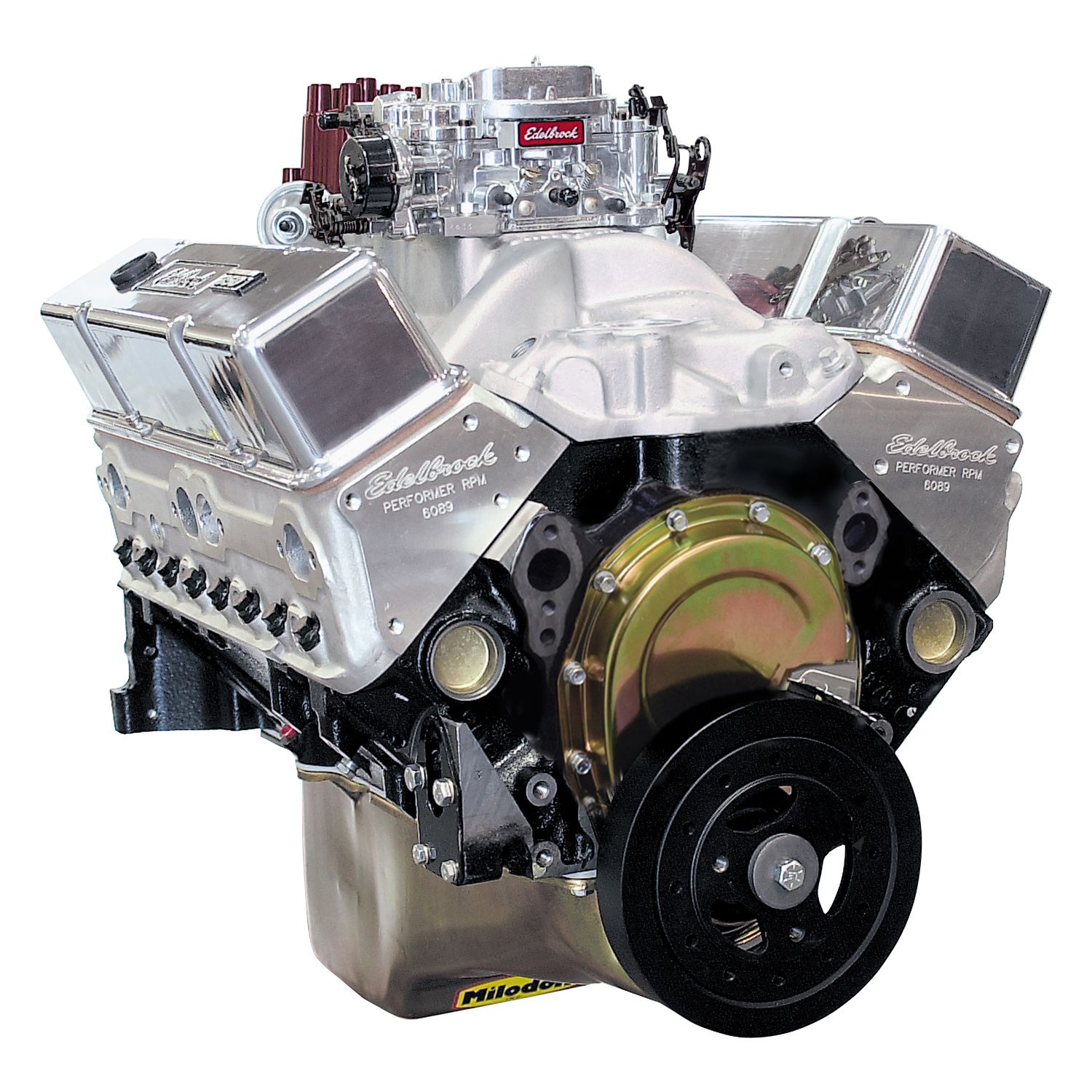 Edelbrock part #45600 Performer RPM 350 small-block Chevy crate engine offers the best of quality and performance with 410 HP & 408 ft/lbs of torque right out of the crate
