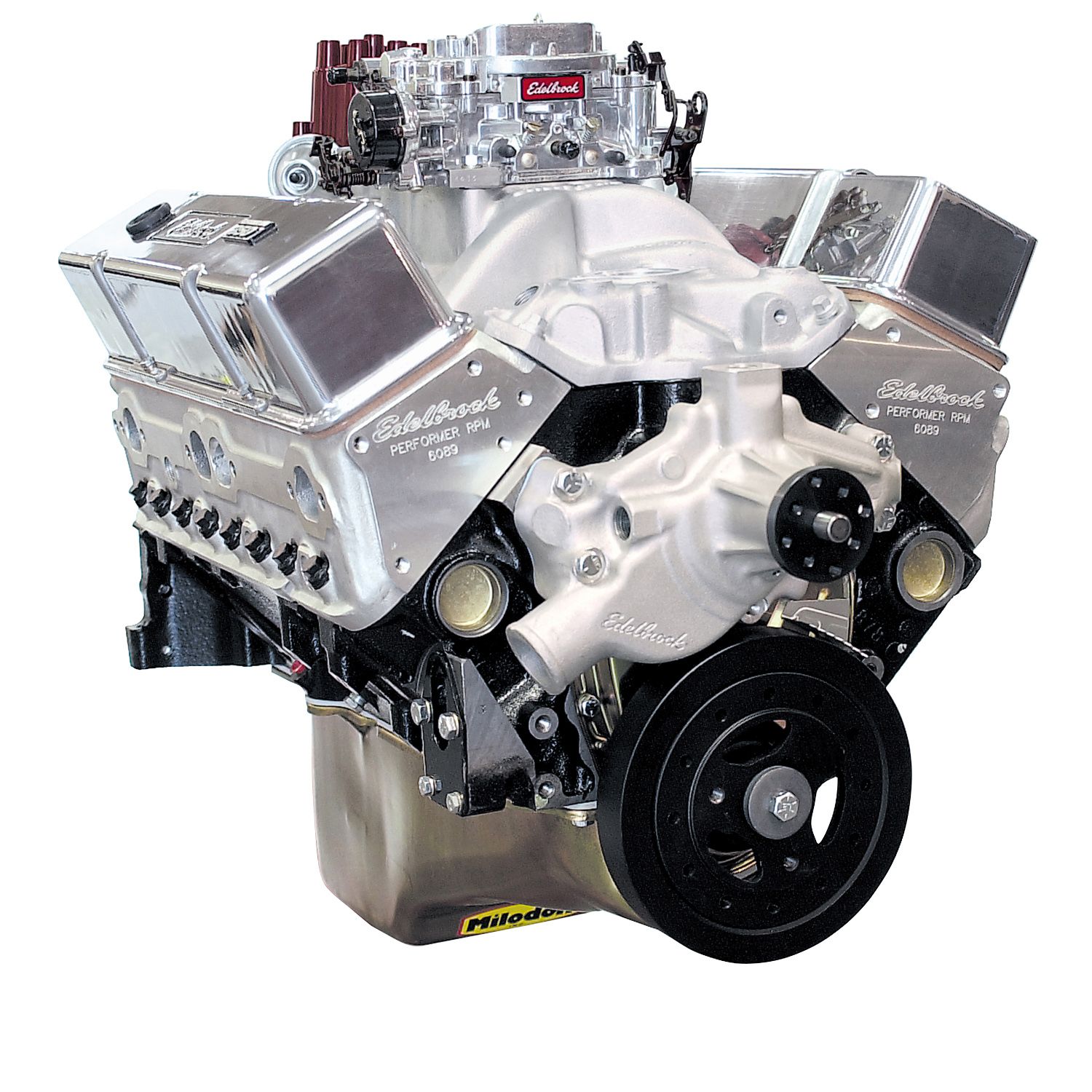 Edelbrock part #45610 Performer RPM 350 small-block Chevy crate engine offers the best of quality and performance with 410 HP & 408 ft/lbs of torque right out of the crate