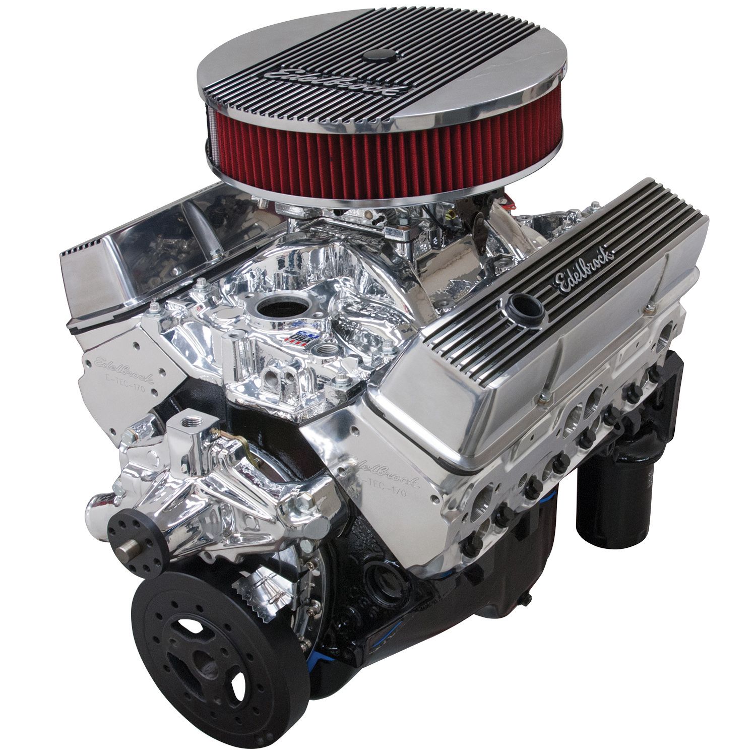 Edelbrock part #46414 Performer Hi-Torq small-block Chevy 350 crate engine offers the best of quality and performance right out of the crate. Take advantage of modern cylinder head and camshaft technology with 363 HP & 405 ft/lbs. of torque. This engine delivers high hp and a broad torque curve from off-idle through 5,500 RPM, thanks to the Performer-Plus Rollin' Thunder hydraulic roller camshaft. In addition to the performance, this combination provides exceptional vacuum at idle so you can easily operate power brakes and vacuum powered accessories. The Performer Hi-Torq crate engine is 100% brand new and include a 4-bolt main short block, Edelbrock E-Tec 170 heads, Rollin' Thunder hydraulic roller camshaft, roller rocker arms, EPS Vortec intake manifold with a EPS 750 cfm carb and short water pump. Engine Specifications: – Finish: EnduraShine – Displacement: 350 c.i.d. – Horsepower: 363 hp – Torque: 405 ft-lbs. – Compression: 9.0:1 – Block: New 4-bolt main w/ 2-piece rear main seal – Crankshaft: Cast Iron – Pistons: Cast Aluminum – Camshaft: Rollin' Thunder Hydraulic Roller #2208 – Rocker Arms: 1.5:1 Roller – Manifold: Performer EPS Vortec #27164 – Cylinder Heads: E-Tec 170 #609715 – Carburetor: EPS 750 cfm carb – Water Pump: Short style water pump #88104 – Distributor: Included – Valve Covers: Elite II – Warranty: 2-year / Unlimited mileage
