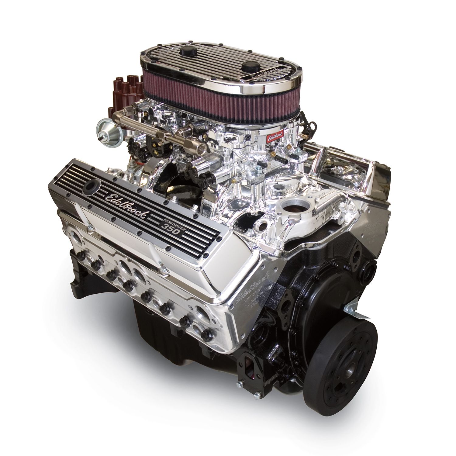 Edelbrock part #45004 Performer small-block Chevy 350 Dual Quad crate engine offers the best of quality and performance with 315 HP & 372 ft/lbs. of torque right out of the crate. This small-block Chevy 350 crate engine is ideal for any street rod, muscle car or truck owner looking for 300+ hp performance on 87-octane fuel. Performer crate engines are 100% brand new and include a 4-bolt main block, Edelbrock Performer heads, hydraulic camshaft, roller rocker arms and RPM Air-Gap Dual-Quad intake manifold with AVS2 500 cfm carbs. Specifications: – Finish: EnduraShine – Displacement: 350 c.i.d. – Horsepower: 315 hp – Torque: 372 ft-lbs. – Compression: 9.0:1 – Block: New 4-bolt main w/ 2-piece rear main seal – Crankshaft: Cast Iron – Pistons: Cast Aluminum – Camshaft: Performer #2102 – Rocker Arms: 1.5:1 Roller – Manifold: RPM Air-Gap #75254 – Cylinder Heads: Performer RPM #608919 – Carburetor: AVS2 500 cfm carbs – Water Pump: Not Included – Distributor: Included – Valve Covers: Elite II Series – Warranty: 2-year / Unlimited mileage