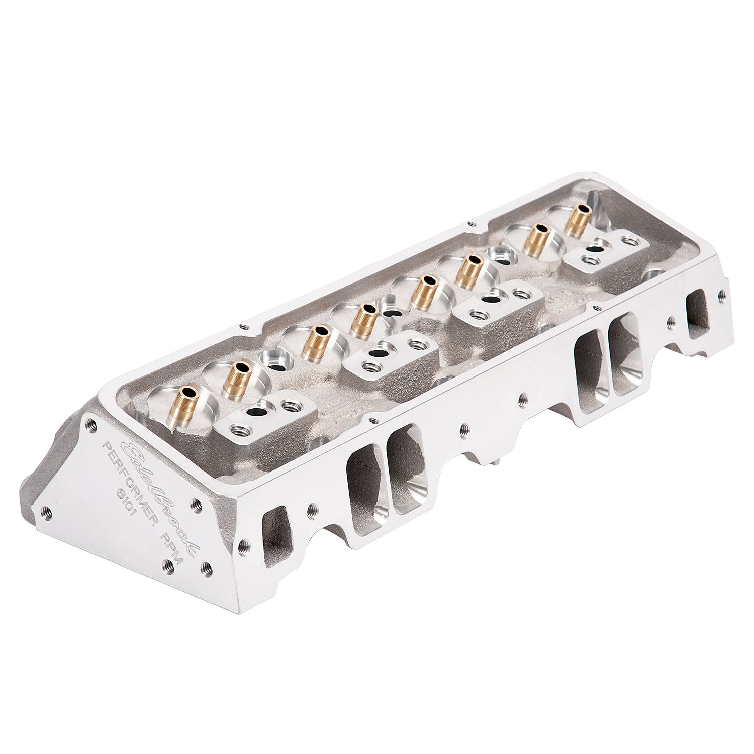 this head can also be used with larger-bore engines if desired. Like the other Edelbrock Performer RPM cylinder head, this features a thick 9/16-inch deck, extra-thick port walls, high-flowing ports, ductile iron seats, one-piece stainless-steel valves, and high-quality rocker studs. This Edelbrock cylinder head also feature state-of-the-art compact combustion chambers and highly efficient ports that offer improved performance and great throttle response throughout the rpm range. Other top-quality features include threaded inserts for rocker studs and exhaust bolts for superior strength and durability, as well as manganese-bronze valve guides. This cylinder head is designed in-house, cast from A356 aluminum, heat treated to T-6 specs, and machined in Edelbrock's Southern California USA manufacturing facilities for unsurpassed quality and performance.