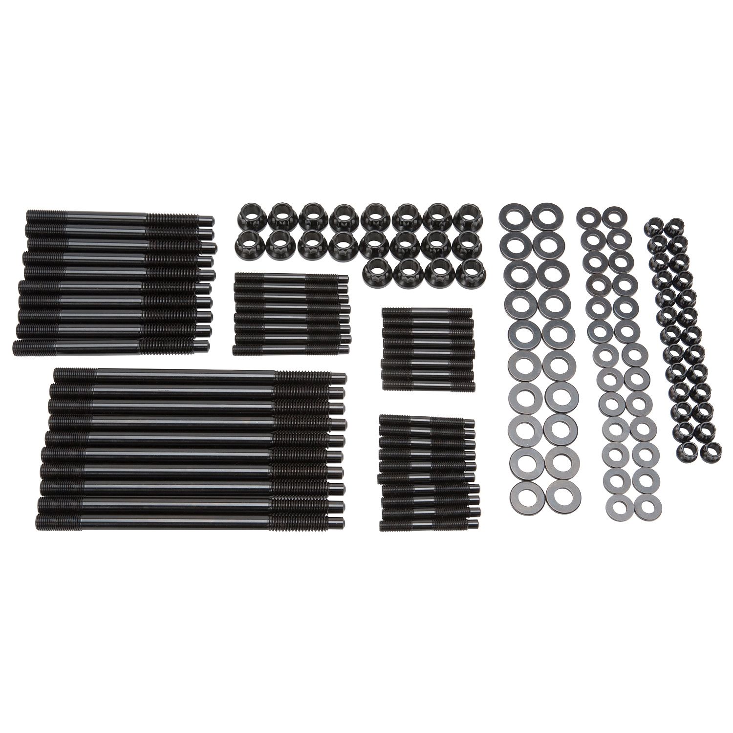 This head stud kit is required when using Edelbrock LS-R cylinder heads #770468 and #770469 on GM LSX engine blocks. Includes 10 7/16" long studs, 10 7/16" short studs, 8 5/16" exhaust studs, 10 5/16" intake flange studs, 8 5/16" valley studs, 20 7/16" washers with nuts and 26 5/16" washers with nuts.