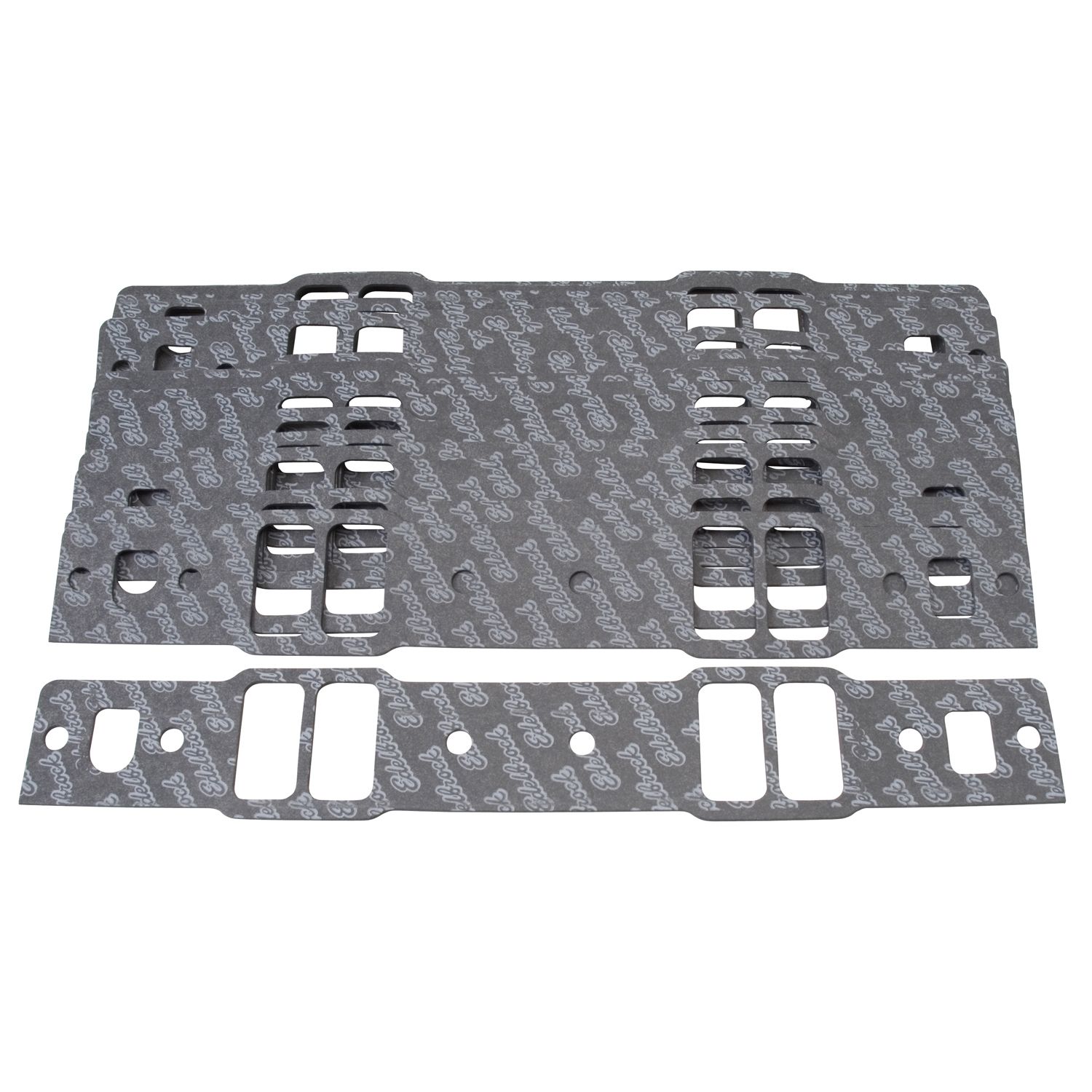 Edelbrock Intake Manifold Gasket set for Small-Block Chevy engines with 2814 intake manifold & GM cast iron bowtie vortex cylinder heads. These gaskets are .060 thick and are a package of 10 sets.