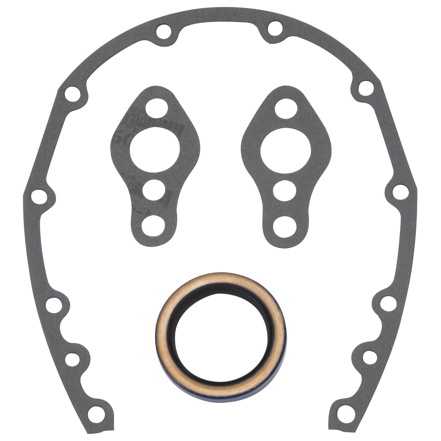 Edelbrock part #6997 Front Timing Cover Gasket set for Small-Block Chevy. Includes front cover gasket and front seal.