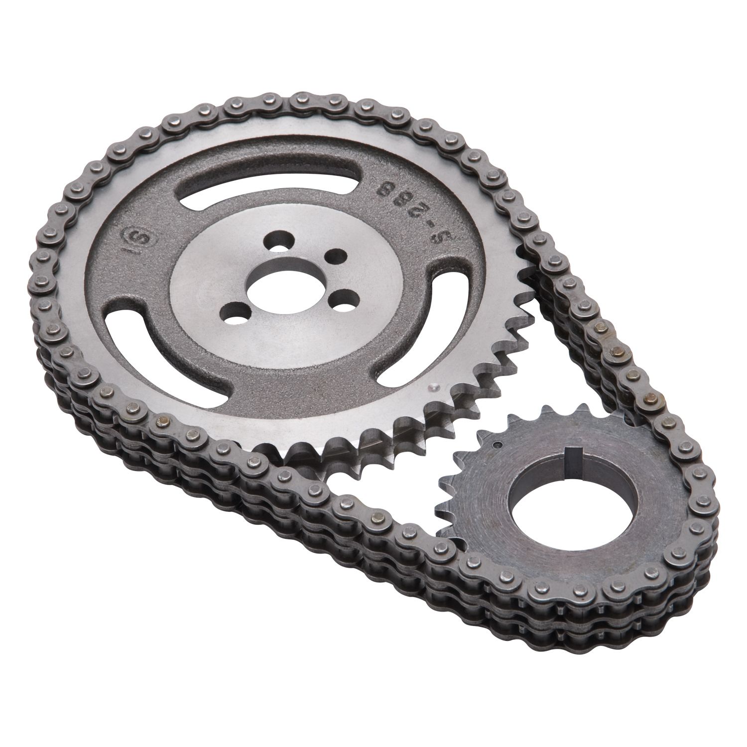 Edelbrock part #7802 Performer-Link timing chain is for use with Edelbrock or stock cams. They have a solid-bushing chain for a true bearing surface that rolls with the sprockets, eliminating chain stretch