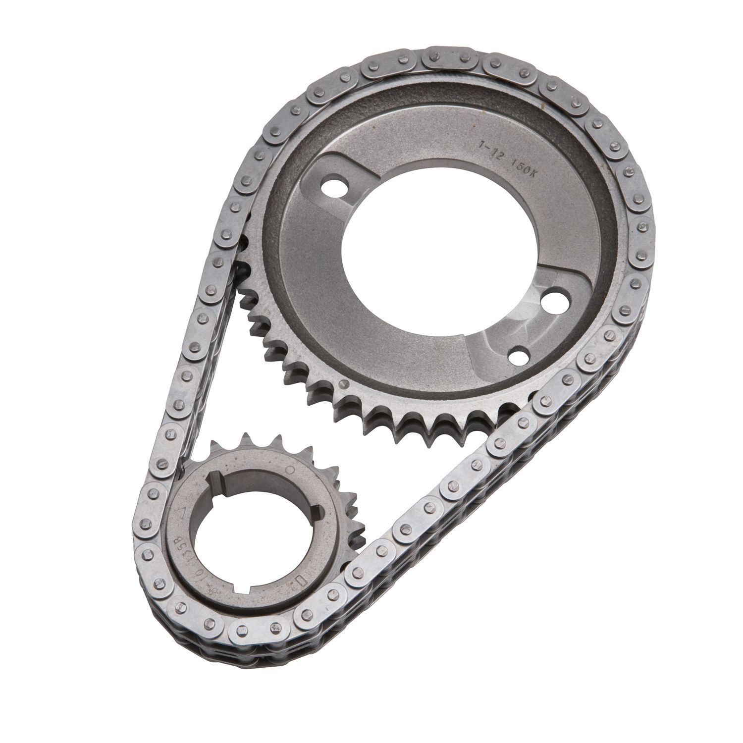 Edelbrock part #7829 Performer-Link timing chain is for use with Edelbrock or stock cams. They have a solid-bushing chain for a true bearing surface that rolls with the sprockets, eliminating chain stretch