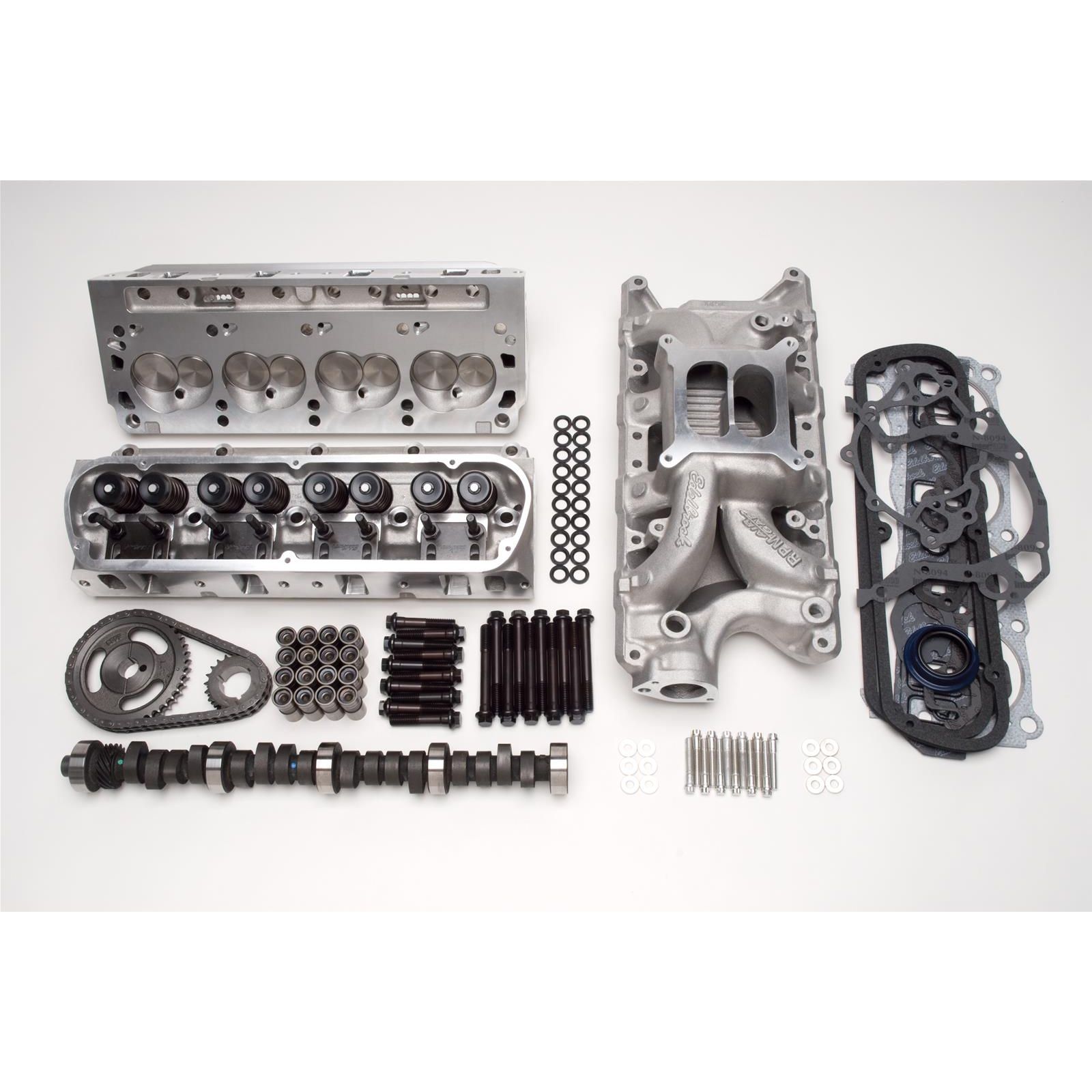 Edelbrock part #2054 Performer RPM Top End Kit is designed for 1962-79 Pontiac 389-467 c.i.d. V-8 engines. This Top End Kit produced 460 HP & 538 TQ on a 468 c.i.d engine with 9.5:1 compression. The kit delivers improved performance in street applications from 1,500 to 6,500 rpm range. This kit includes an RPM intake manifold, Performer D-Port 87cc cylinder heads, hydraulic cam and lifters, timing chain complete bolt kits and an Edelbrock gasket set. To get great performance out of any engine, all of the components must work together. For over 30 years, the Edelbrock Total Power Package system has solved the parts matching puzzle for many street performance enthusiasts. With the introduction our Power Package Top End Kits, now you can get the best Edelbrock performance in-one-box, under one part number with "no guesswork" involved.