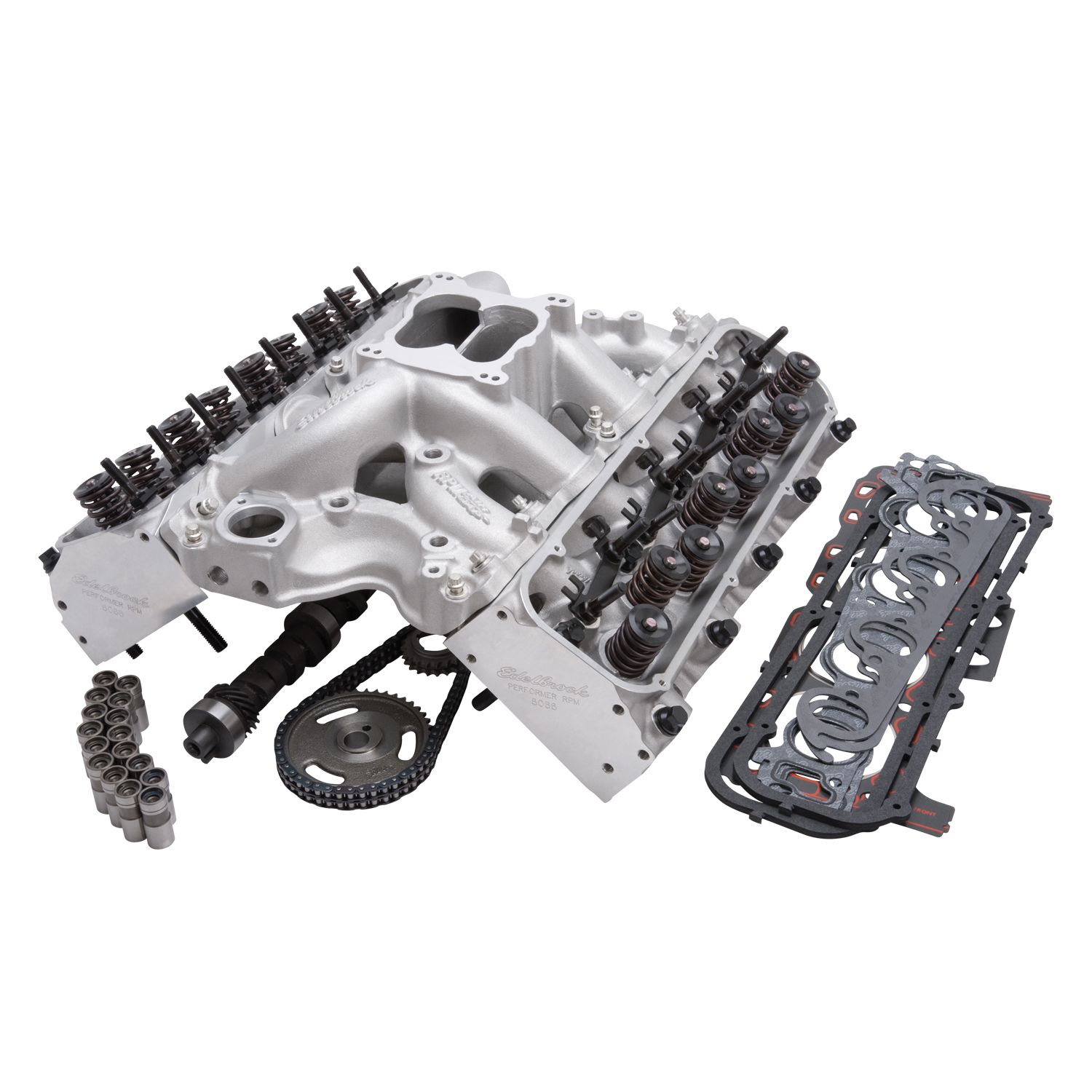 Edelbrock Part #2045 Performer RPM Top End Kit is designed for 1968-87 Big-Block Ford 460-522 V-8 engines. This Top End Kit produced 506 HP & 536 TQ on a 460-522 Big-Block Ford engine. The kit delivers improved performance in street applications from 1,500 to 6,500 rpm range. This kit includes RPM Air-Gap intake manifold, Performer RPM cylinder heads, hydraulic cam and lifters, timing chain, complete bolt kits and an Edelbrock gasket set. To get great performance out of any engine, all of the components must work together. For over 30 years, the Edelbrock Total Power Package system has solved the parts matching puzzle for many street performance enthusiasts. However, with the introduction our Power Package Top End Kits, now you can get the best Edelbrock performance in-one-box, under one part number with "no guesswork" involved.