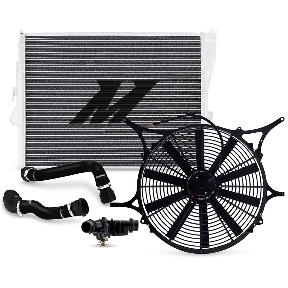 Restore and enhance your cooling system with the Mishimoto Essentials Bundle. The Mishimoto Essentials Bundle includes high-quality upgraded cooling components to replace items we've found to be the most failure-prone. For the 1999-2006 BMW Non-M 3-Series, we've bundled together our aluminum radiator, silicone radiator hose kit, performance aluminum fan shroud kit, and racing thermostat.As the stand-out component, our aluminum radiator features full aluminum construction with durable TIG-welded end tanks. This radiator features a 20-percent increase in coolant capacity and a 41-percent increase in air surface area to provide optimal heat dissipation. In addition, our radiator features precise CNC-machined quick disconnect fittings for a hassle-free installation. To supplement our robust radiator, we've included our incredibly durable silicone radiator hose kit. Mishimoto silicone hoses are constructed from high-grade 4-ply silicone with heat-resistant embedded fibers for superior heat and pressure tolerance. In addition, our silicone hose kit includes brand-new quick disconnect hose ends for a durable, leak-free connection. Also included in our Essentials Bundle is the Mishimoto Performance Aluminum Fan Shroud Kit. This kit utilizes a high-flow 16-in electric fan to provide 1850cfm of airflow. Within this kit is our adjustable fan controller kit, providing everything you need for an easy installation. Rounding out our Essentials Bundle is our racing thermostat for the E46 3-series. The Mishimoto thermostat has a lower activation temperature (158F) than the factory thermostat (206F). The lower activation temperature allows coolant to flow through the engine earlier, reducing the risk of overheating in hot environments. Time to re-habilitate the cooling system of your E46 with the Mishimoto Essentials Bundle. As with all our products, this Bundle includes the signature Mishimoto Lifetime Warranty.