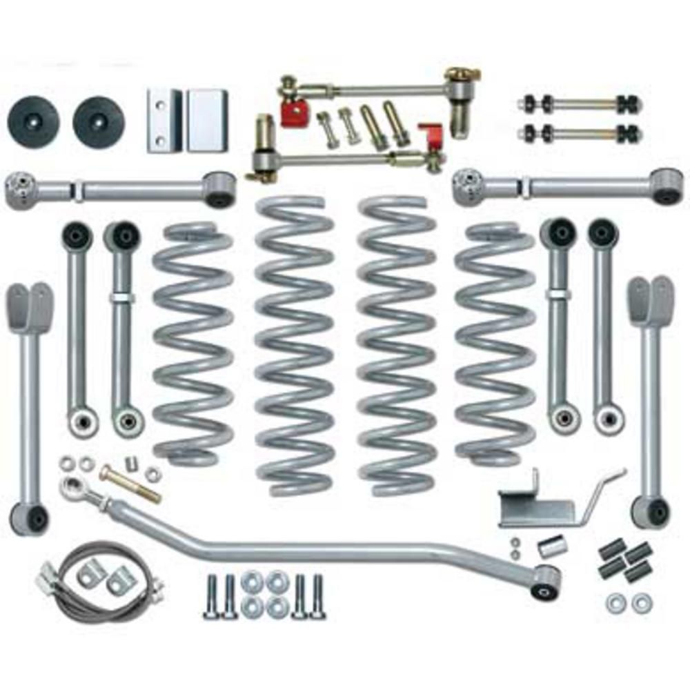 Designed For LJ Owners Who Already Have A Rubicon Express Super-Flex Short Arm Suspension System, These Kits Allow You To Upgrade To The Extreme-Duty Long Arm System. Our Extreme-Duty Long Arm System Will Provide Noticeable Improvements In Your LJ'S On Road Handling, Returning A Nearly Stock Ride Quality. Off Road You Will See Unmatched Performance On The Most Extreme Trails. These Upgrade Systems Include A Three-Piece Belly Pan For Easy Transfer Case And Transmission Access; Rear Stainless Steel Brake Lines Abd The Chromoly Rubicon Express Extreme-Duty Long Arms. Lift Heights Depends On The System You Are Upgrading. Rubicon'S Long Arm Tri-Link System Eliminates The Rear Track Bar, Allowing For True Up/Down Wheel Travel, While Enhancing Anti-Squat For Those Steep ClimBS. On-Road Tracking Is Improved, And The Kit Is Bolt-On For Factory Dana 35 And Dana 44 Rear Ends. Kit Includes Front And Rear Control Arms Using 2 .250 Wall, 4130 Chromoly Material. Also Included With The Kit Is Rubicon'S Newest Misalignment Joint Design, The Builder Ball. This Setup Eliminates The Rear Track Bar And Has Up To 32 Degrees Of Misalignment In A Giant-Sized 3" Od Housing.