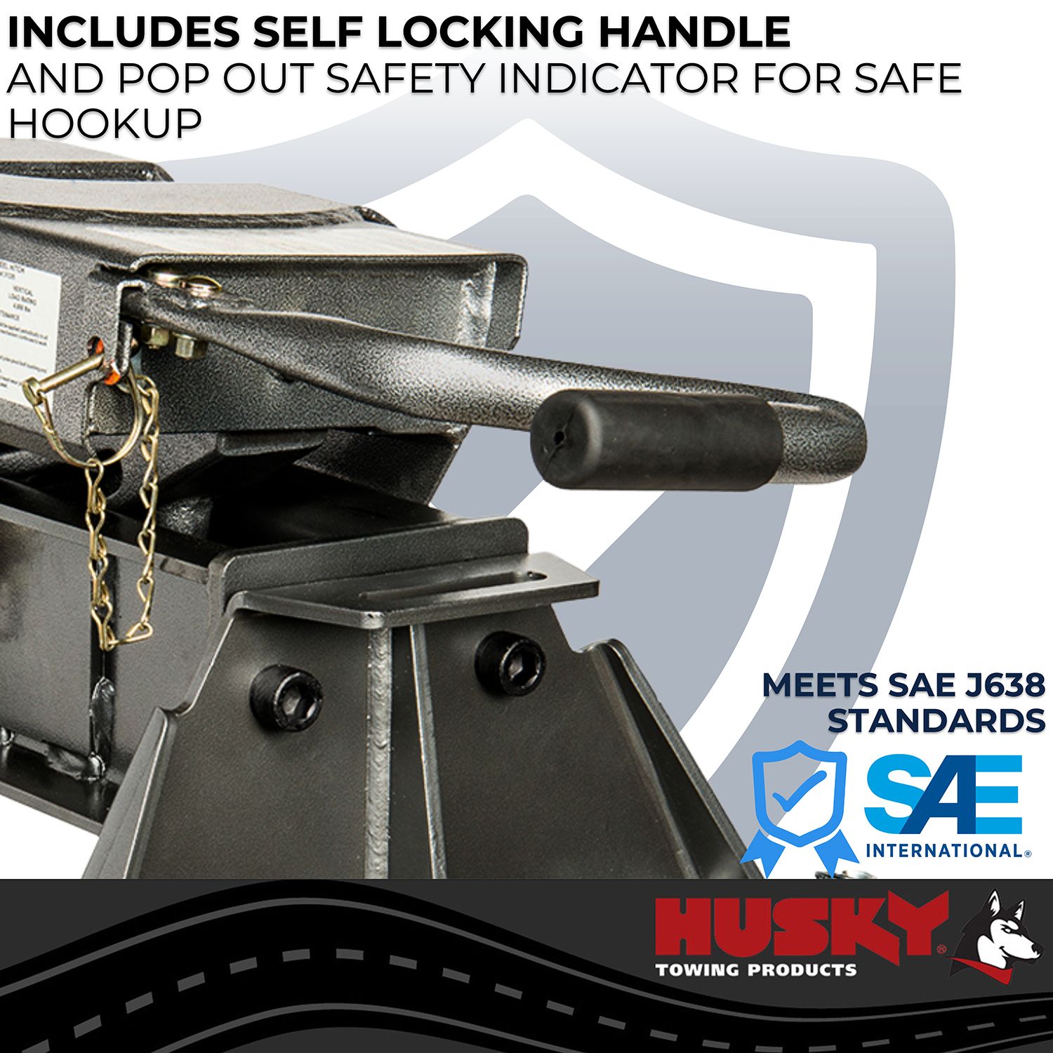 Once on the road, added articulation takes torque twist out of both truck and trailer for a smoother ride and less stress on equipment. A patented anti walk wrap around jaw fully encloses the trailer kingpin. A visible safety indicator shows red when the jaw is open. An automotive OEM quality metallic paint provides a superior finish and gives the 16,000 W and 26,000 W hitches an attractive, rugged look. The 26,000 W can be used with all 5th wheels up to 26,000 Pounds. Meets or exceeds the new SAE fifth wheel test standards.