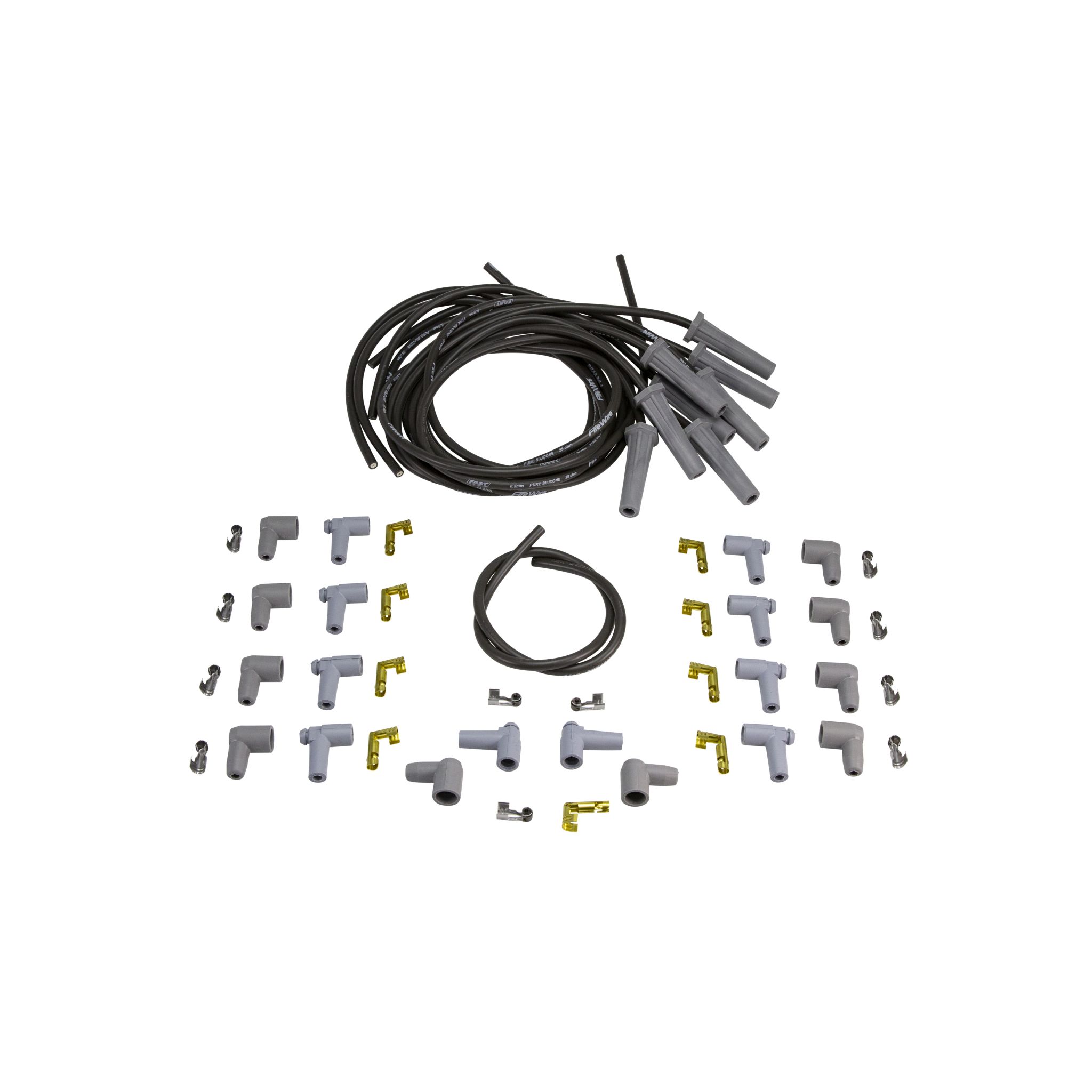 Having a high powered ignition control is only half the equation when it comes to your engine?s performance ? you also need to ensure that the voltage makes it to the spark plug. The FAST FireWire Spark Plug Wire was designed for performance and racing from the inside-out! For FAST, one of the most important aspects of engineering the low resistance FireWire was to ensure it could effectively filter the electro-magnetic interference and "noise" that occurs within spark plug wires. The answer lies within a unique reactive core design that effectively suppresses EMI ensuring trouble-free operation of the ignition control, EFI system and other on-board electronics. From a performance standpoint, the conductor of the FireWire features the lowest resistance, less than 25 ohms per foot, of resistance. Less resistance means the most spark energy reaches the plug gap for every firing. To combat the extreme conditions that wires face under the hood, the core and conductor are protected with a sleeve of double-layered, pure silicone. This design is effective against header heat, oils and abrasion, and to complete the package, our silicone boots can withstand 550?F!