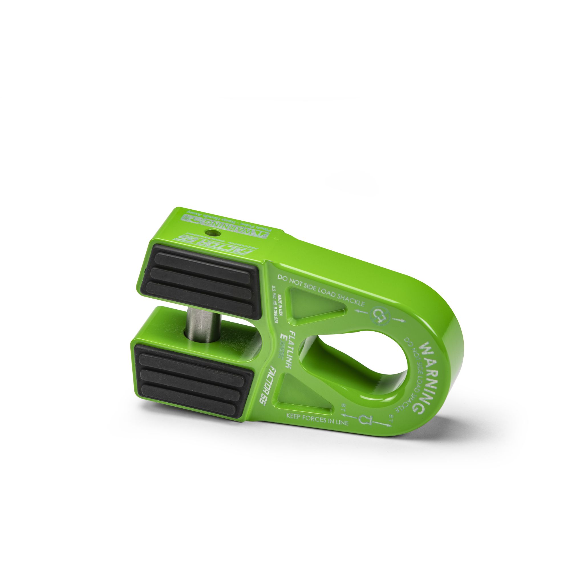 The FlatLink E folding shackle mount for recovery winches that eliminates the conventional winch hook and provides a versatile shackle mounting opening