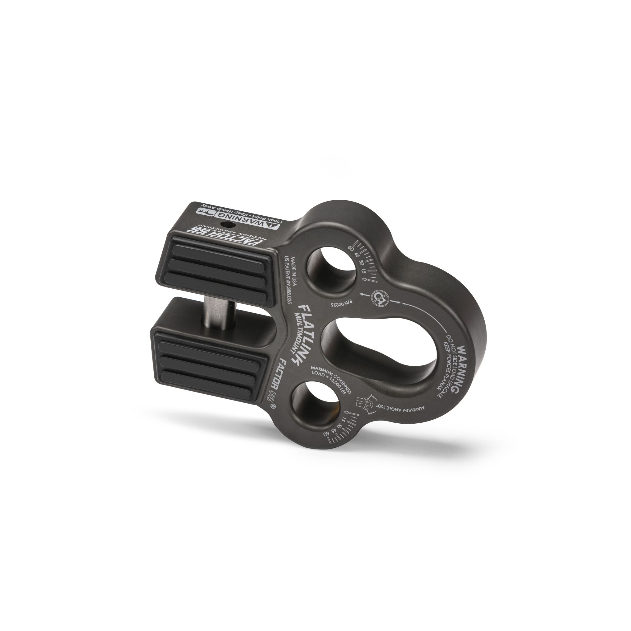 FlatLink MultiMount is designed for difficult vehicle recovery scenarios with two additional shackle pin mounting holes that provide secure shackle attachment points for multiple winch pull directions; the center hole provides a secure shackle mount point for either end of a bow shackle or soft-shackle. This arrangement eliminates any shackle side loading forces at the MultiMount interface (Shackles are free to rotate and align to the load directions). Winching with a bridle arrangement is also possible by using the two outer shackle pin mounting holes in combination with common bridle rigging. Like the rest of the FlatLink product line, the MultiMount may be folded flat against fairlead surfaces when stowed, resulting in minimal impact to vehicle approach angles. Engineered, tested, and made in the USA.