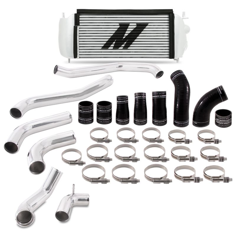 TechSpec Includes: (1) Mishimoto Intercooler w/ Assembled Rubber Trim–(1) Bypass Valve Bracket–(1) Aluminum Cold-Side Intercooler Pipe w/ CNC Quick-Disconnect Flange–(1) Aluminum Cold-Side Intercooler Pipe w/ CNC IAT Sensor Housing–(4) Aluminum Hot-Side Intercooler Pipes–(8) Silicone Boots w/ DuraCore Technology–(16) Constant-Tension Worm Gear Clamps–Mounting Hardware–Bypass Valve Hardware–Mishimoto Lifetime Warranty