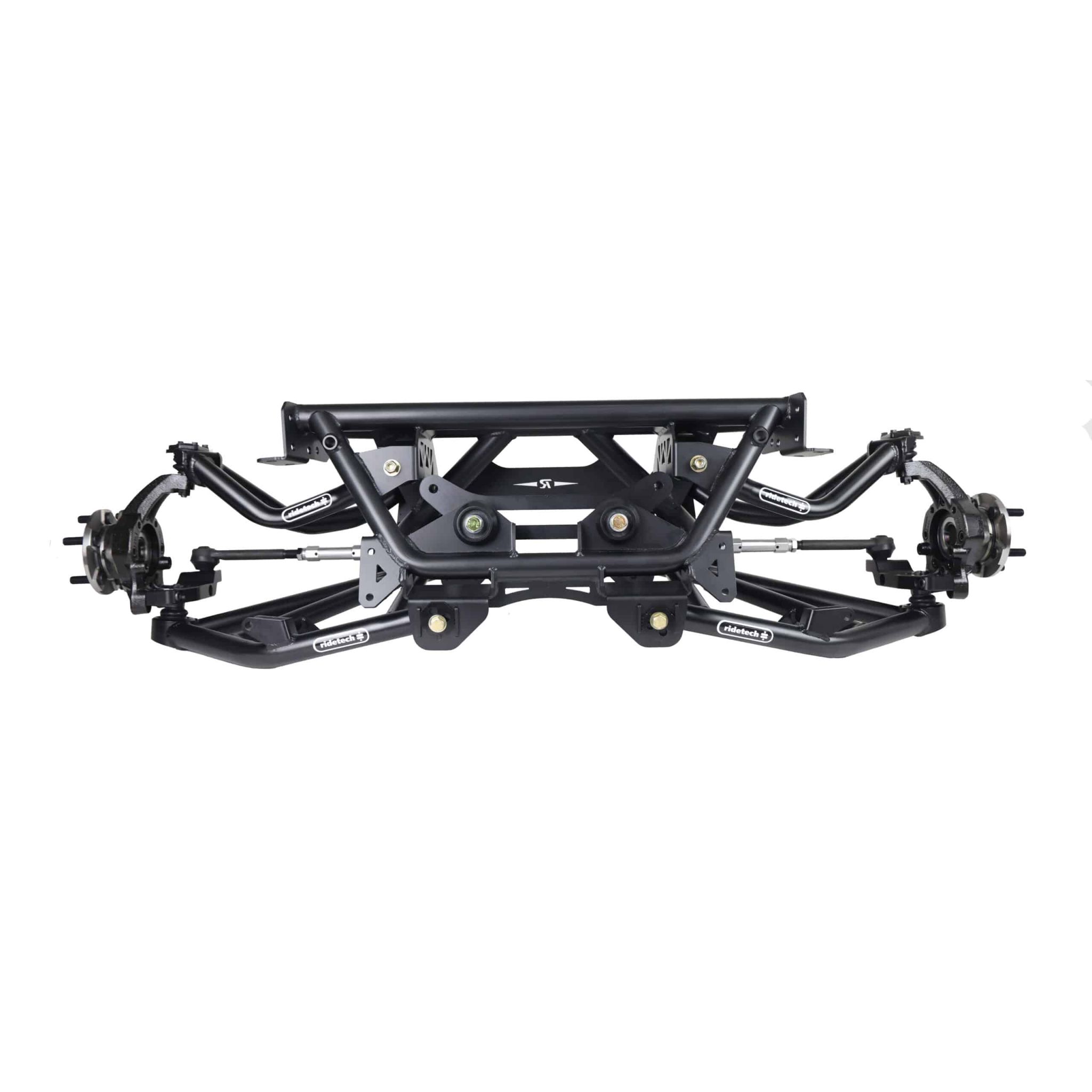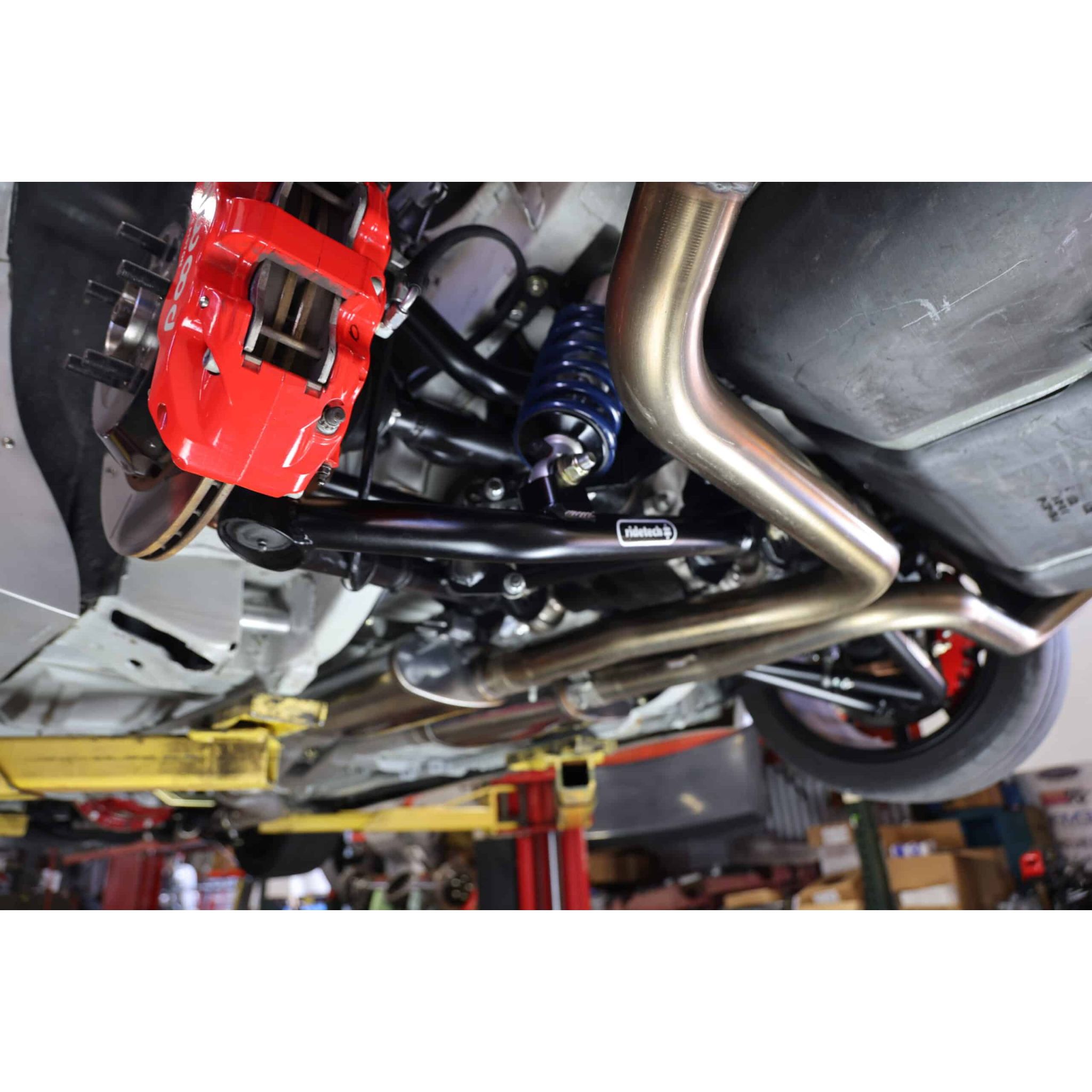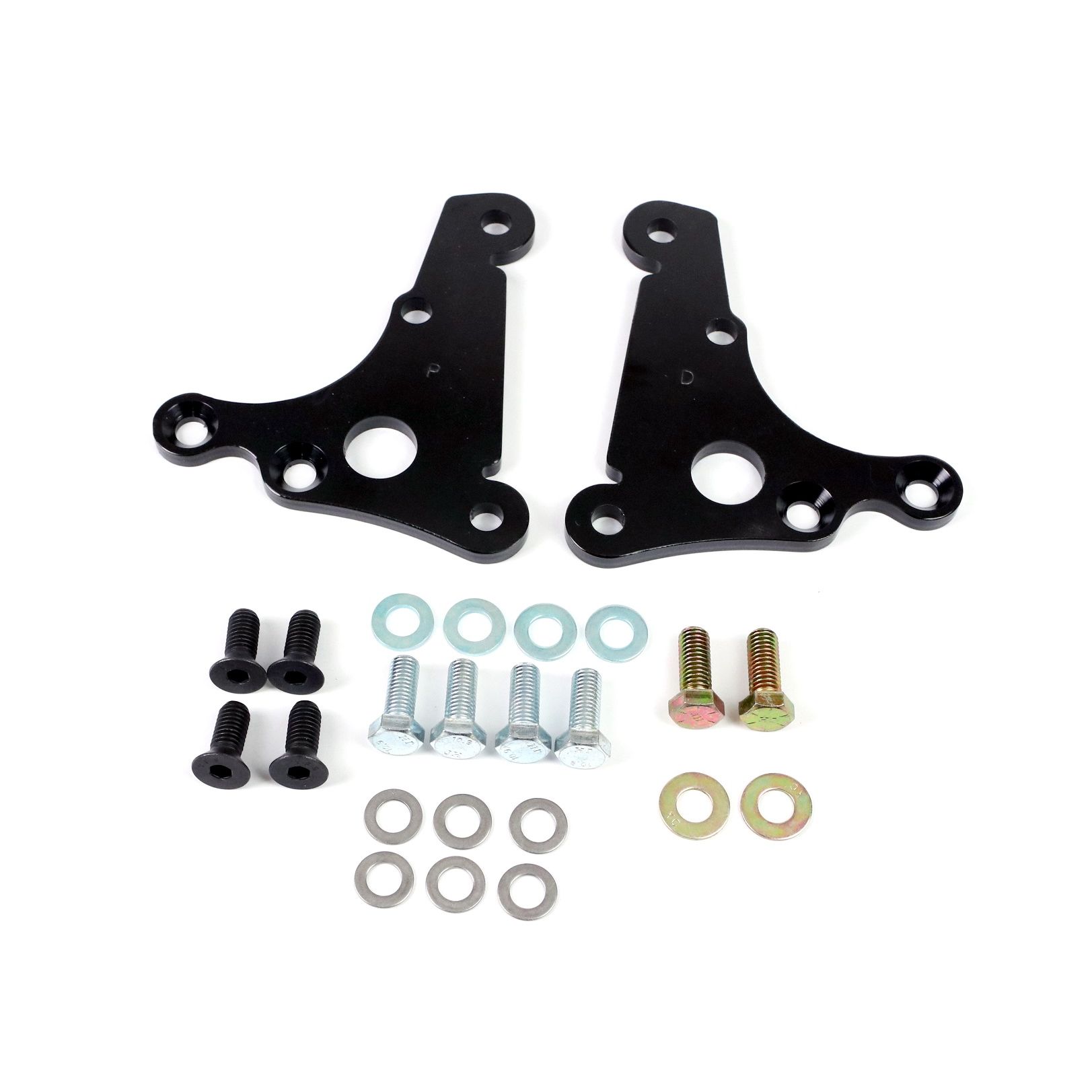Front caliper brackets for S550 (15-23 Mustang) brakes with Ridetech 79-93 Mustang SLA. Includes a pair of brackets, caliper spacers, shims and hardware.