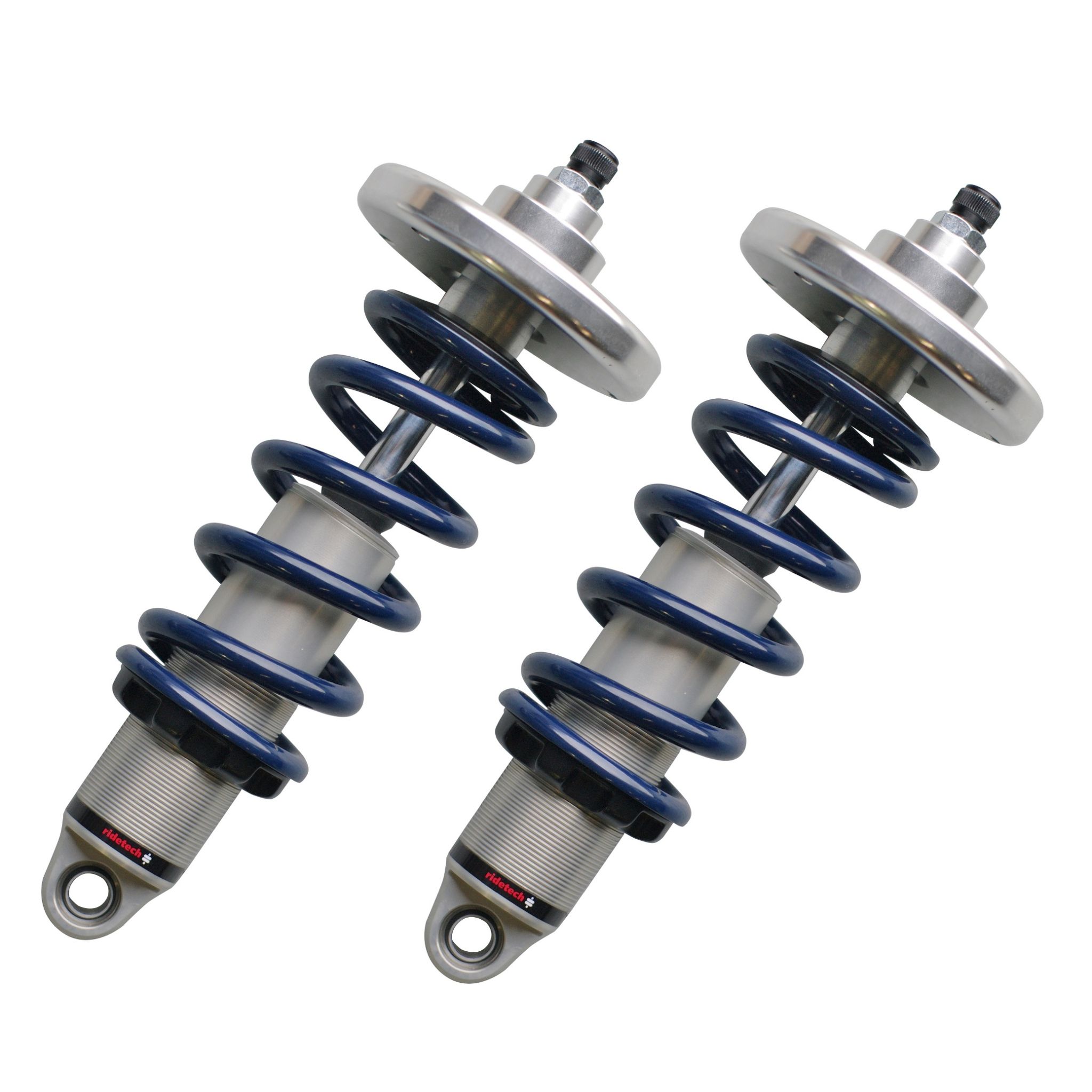 Front HQ Coil-Overs for 1967-1970 Mustang. For use with Ridetech upper arms. Includes a pair of rebound adjustable shocks, springs, spring mounts, delrin spring washers and billet adapter.