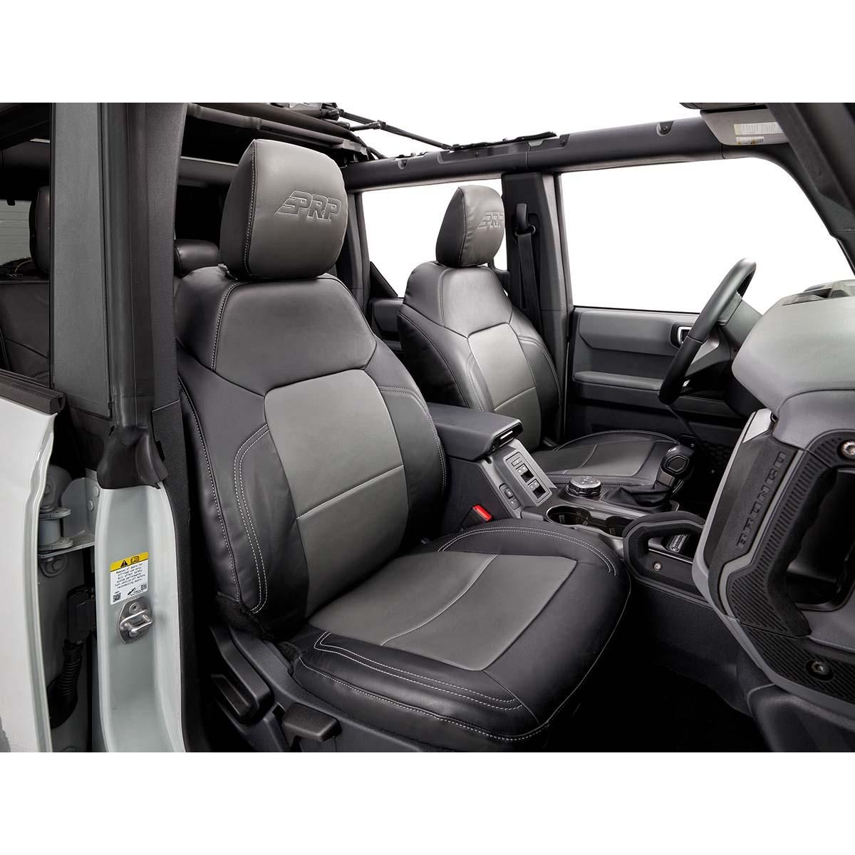 PRP's Front Seat Covers for the 21+ Ford Bronco brings a whole new look to your interior. These covers have been expertly crafted to fit perfectly over your factory front seats, providing an OEM fit and finish. Install yourself or through a certified PRP installer. Made from durable marine-grade vinyl, so they can handle the abuse from both on and off-road environments. The covers install over your stock upholstery and are side-impact airbag compatible. Sold as a pair. Customize it and make it yours! with over 60+ different colors and materials to choose from. AVAILABLE FOR: B058 (Ford Bronco 2D Front Seats) – 2021+ Ford Bronco Base (2 Door) 2021+ Ford Bronco Big Bend (2 Door) 2021+ Ford Bronco Black Diamond (2 Door) 2021+ Ford Bronco Outer Banks (2 Door) 2021+ Ford Bronco Badlands (2 Door) 2021+ Ford Bronco Wildtrak (2 Door) 2021+ Ford Bronco First Edition (2 Door) B060 (Ford Bronco 4D Front Seats) – 2021+ Ford Bronco Base (4 Door) 2021+ Ford Bronco Big Bend (4 Door) 2021+ Ford Bronco Black Diamond (4 Door) 2021+ Ford Bronco Outer Banks (4 Door) 2021+ Ford Bronco Badlands (4 Door) 2021+ Ford Bronco Wildtrak (4 Door) 2021+ Ford Bronco First Edition (4 Door) *Does not fit Brono Sport Models