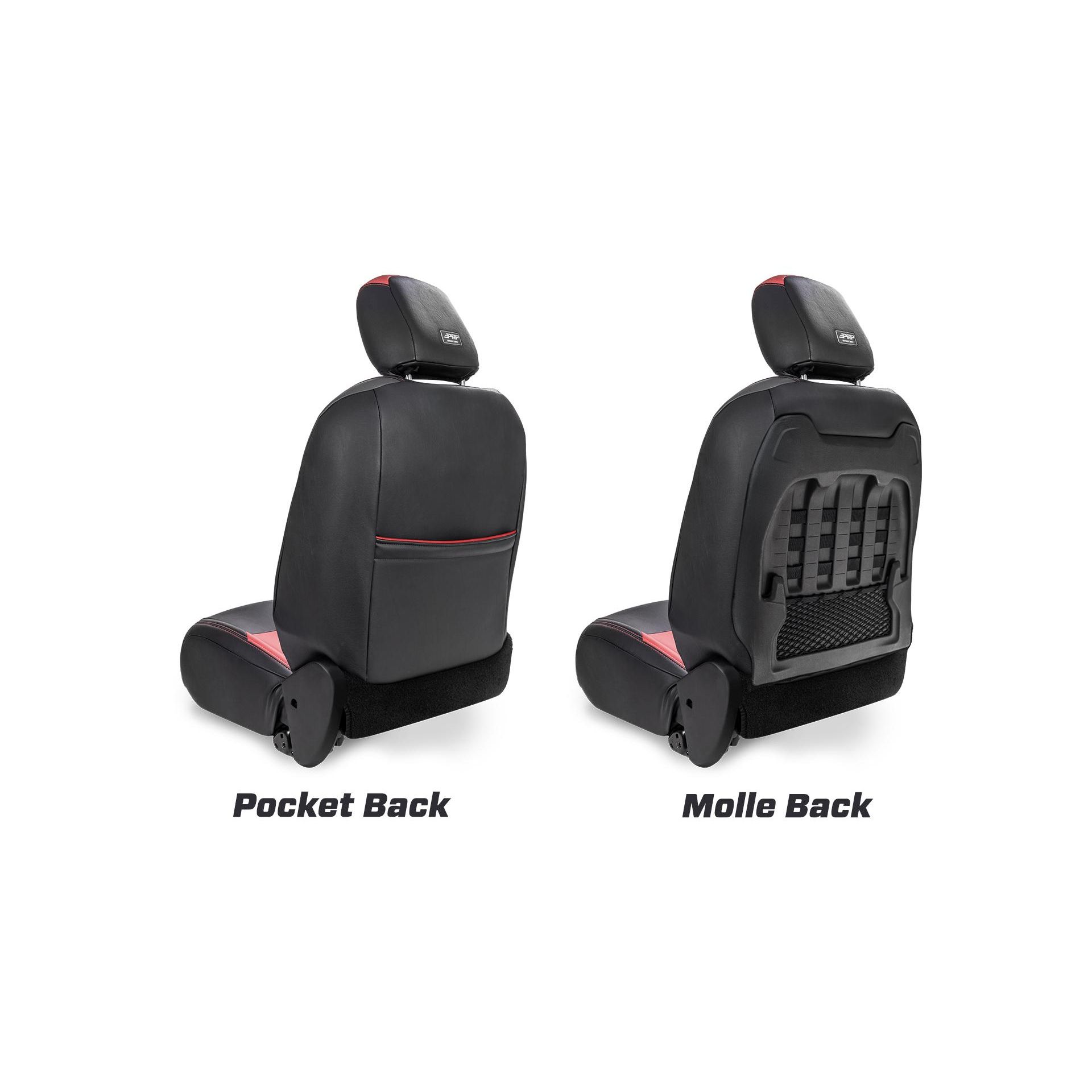 PRP's Seat Covers for the Jeep Wrangler JL & Jeep Gladiator JT bring a whole new look to your interior. Whether you use it as a daily driver or treking through backcountry trails, you’ll get the protection and customization that only PRP Seat Covers can offer. These covers have been expertly crafted to fit perfectly over your factory Jeep seats providing an OEM fit and finish. Made from durable water and UV resistant materials, they can handle the abuse from both on and off-road environments. The covers install over your stock upholstery, and are side impact airbag compatible. You can install these covers yourself, or through a certified PRP installer. Made from durable and water resistant vinyl. Sold as a pair. Proudly made in the USA. Complete your whole interior with our matching Rear Seat and Center Console Covers! Fitment: Several different seat covers models are available depending on your vehicle: for those have the seats that feature the Plastic Molle seat back, and the standard Pocket Seat Back for all other Wrangler & Gladiator Editions. *Note- These covers are only for seats with Manual Seat Adjusters. Covers for seats with Electric Seat Adjusters – Coming Soon. FRONT SEAT COVERS AVAILABLE FOR THE FOLLOWING JEEP MODELS: 2018+ Wrangler JL 2 Door (Pocket Back) – B037 2018+ Wrangler JL 2 Door (Molle Back) – B038 2018+ Wrangler JL 4 Door, 2020+ Gladiator JT, 4XE (Pocket Back) – B039 2018+ Wrangler JL 4 Door, 2020+ Gladiator JT, 4XE (Molle Back) – B040 2020+ Gladiator JT Mojave Edition & Wrangler JLU 392 Edition (has larger bolsters on seats) – B063 *Note – Does not fit 2025 models that have Electric Seat Adjustments. Only works on front seats with manual seat adjustment knobs.