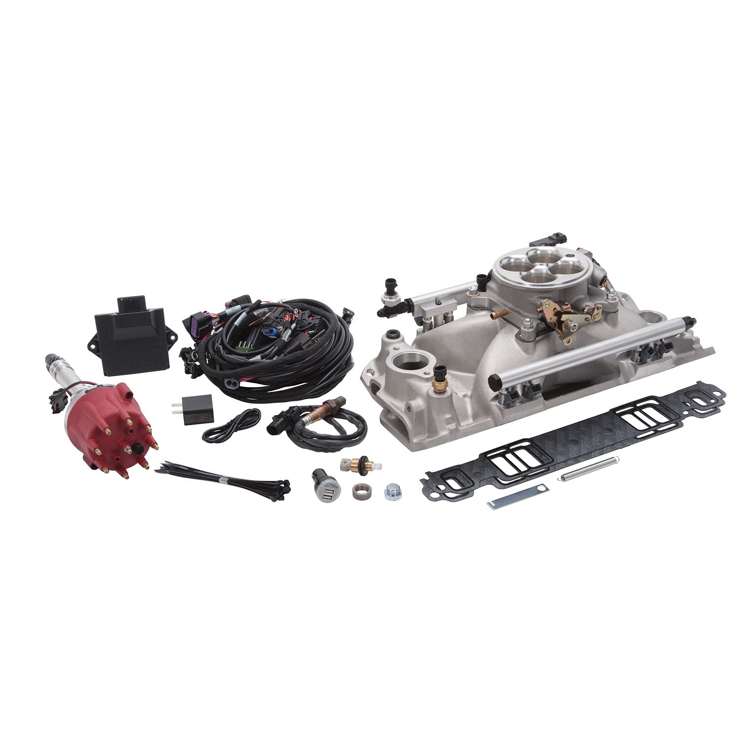 The Edelbrock Pro-Flo 4 EFI Kit #35690 for 1986-earlier small-block Chevy engines is a fully sequential multi-port injection system designed with a fuel injector positioned in each runner of the intake manifold to deliver the best fuel atomization and most even distribution to each cylinder. This system features the high-performance Super Victor single-plane intake manifold that comes preassembled with high-flow injectors, fuel rails and 4150-flange throttle body. All supporting sensors are included along with wire harnesses and ECU. The Super Victor SBC manifold is designed with a larger cross-sectional area in the plenum and large runners for high-horsepower and/or large cubic-inch applications. This kit uses 42 lb/hr injectors and is rated for 675 horsepower at 58 PSI of fuel pressure.The exclusive Edelbrock E-Tuner 4 app is Free and Available for Android and IOS based smart phone or tablet.
