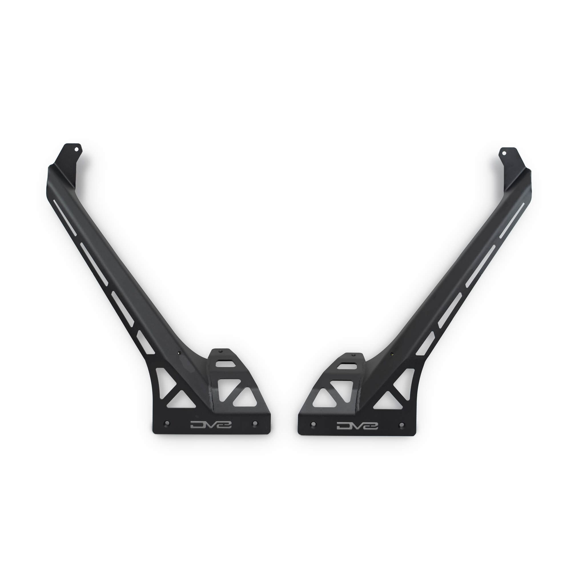 Our low-profile light bar mount lets you attach a 50-inch LED light bar just above your rig's windshield. It's designed to be low-profile to reduce wind noise, but won't block your view. The mount fits most 50-inch light bars and has a hidden channel for tidy wiring. Mount to mount measures 52-inches. It also comes with foam to protect your rig's paint. The 3-bolt setup keeps the light bar secure on rough roads. The black powder coating prevents rust, and it's easy to install on factory bolt hole locations. These were designed for use with our A-Pillar Dual Light Pod Mounts (optional) to provide maximum trail lighting.