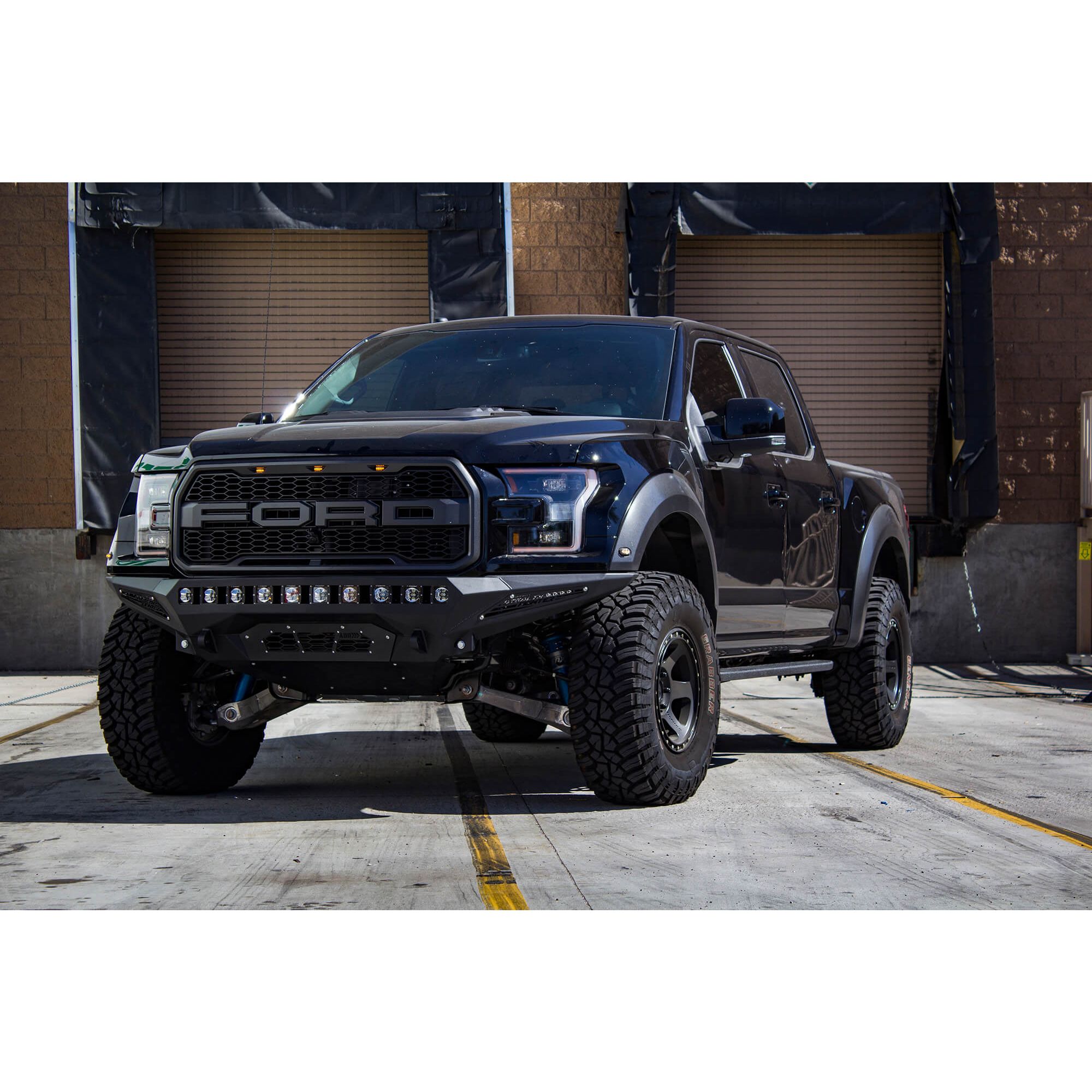 Addictive Desert Designs Stealth Fighter front bumper for the 2017 Ford Raptor is one of our tightest fitting and most aggressive looking bumpers on the market. Measuring only 1/2" farther from the grille than the factory bumper the Stealth Fighter gives your Raptor a tight fitting steel plate designed bumper. A modern radius plate design allows the Stealth Fighter to keep a tight fit around the front of your truck to match the factory design, while giving your the added protection of a steel plated bumper. The center of the bumper has a universal light mount system that allows you to mount up to 10 cube lights or a 40" radius or straight LED, or anything in between to give your Ford Raptor the additional lighting setup that you need. Additional mounts for RIGID 10" SR LEDs behind the side panels give your Raptor even more lighting options.
