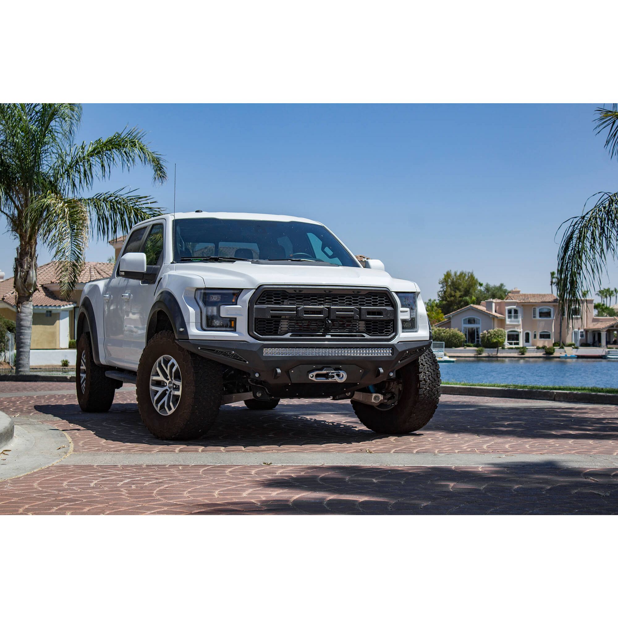 Addictive Desert Designs Stealth Fighter front bumper for the 2017 Ford Raptor is one of our tightest fitting and most aggressive looking bumpers on the market. Measuring only 1/2" farther from the grille than the factory bumper the Stealth Fighter gives your Raptor a tight fitting steel plate designed bumper. A modern radius plate design allows the Stealth Fighter to keep a tight fit around the front of your truck to match the factory design, while giving your the added protection of a steel plated bumper. The center of the bumper has a universal light mount system that allows you to mount up to 10 cube lights or a 40" radius or straight LED, or anything in between to give your Ford Raptor the additional lighting setup that you need. Additional mounts for RIGID 10" SR LEDs behind the side panels give your Raptor even more lighting options.