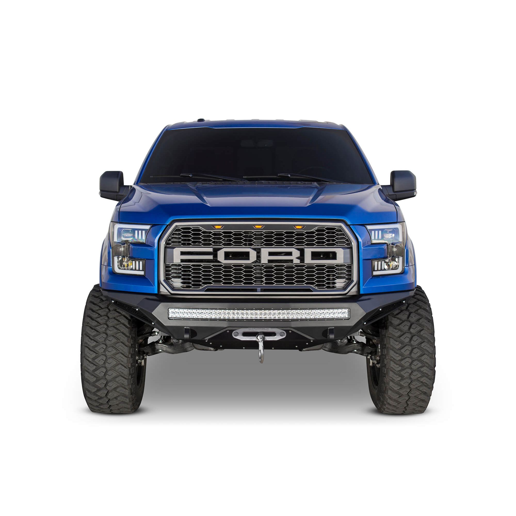 The Stealth Fighter front bumper for the Ford F-150 is one of our tightest fitting and most aggressive looking bumpers on the market. A modern radius plate design allows the Stealth Fighter to keep a tight fit around the front of your truck to match the factory design, while giving you the added protection of a steel plated bumper. The center of the bumper has a universal light mount system that allows you to mount up to 10 cube lights or a 40" radius or straight LED, or anything in between to give your F-150 the additional lighting setup that you need. Additional mounts for RIGID 10" SR LEDs behind the side panels give your truck even more lighting options.