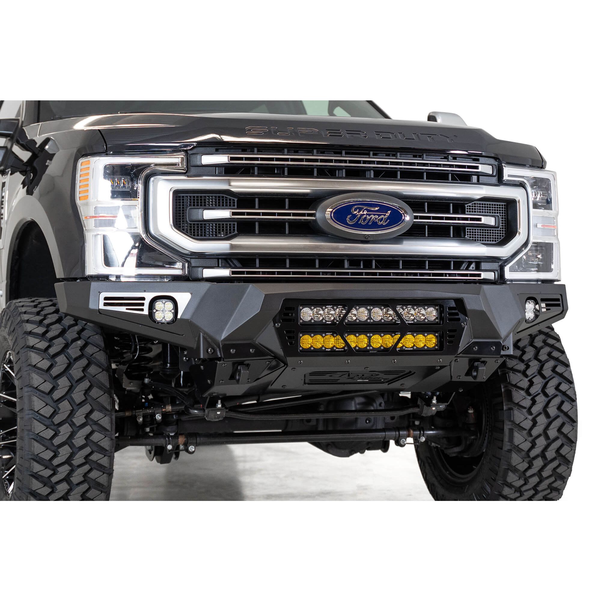 The Addictive Desert Designs Bomber front bumper brings the ultimate combination of form and function to the Ford F250/F350. A full 3/16" aluminum skid plate offers superior protection while keeping the bumper lightweight. Three different light options are offered: 4 Rigid 360 6" light mounts, 3 Baja Designs LP6 light mounts, or two 20" light bar mounts. Each side panel provides an additional cube light mount. Reinforced clevis mounts are bolted straight to the frame for unrivaled strength and supply a mounting point for 3/4" D-rings. As always, this bumper is fully bolt-on and made in America.