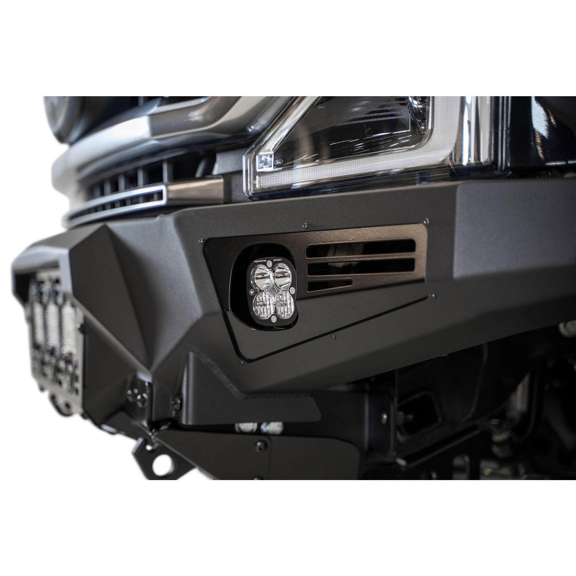 The Addictive Desert Designs Bomber front bumper brings the ultimate combination of form and function to the Ford F250/F350. A full 3/16" aluminum skid plate offers superior protection while keeping the bumper lightweight. Three different light options are offered: 4 Rigid 360 6" light mounts, 3 Baja Designs LP6 light mounts, or two 20" light bar mounts. Each side panel provides an additional cube light mount. Reinforced clevis mounts are bolted straight to the frame for unrivaled strength and supply a mounting point for 3/4" D-rings. As always, this bumper is fully bolt-on and made in America.