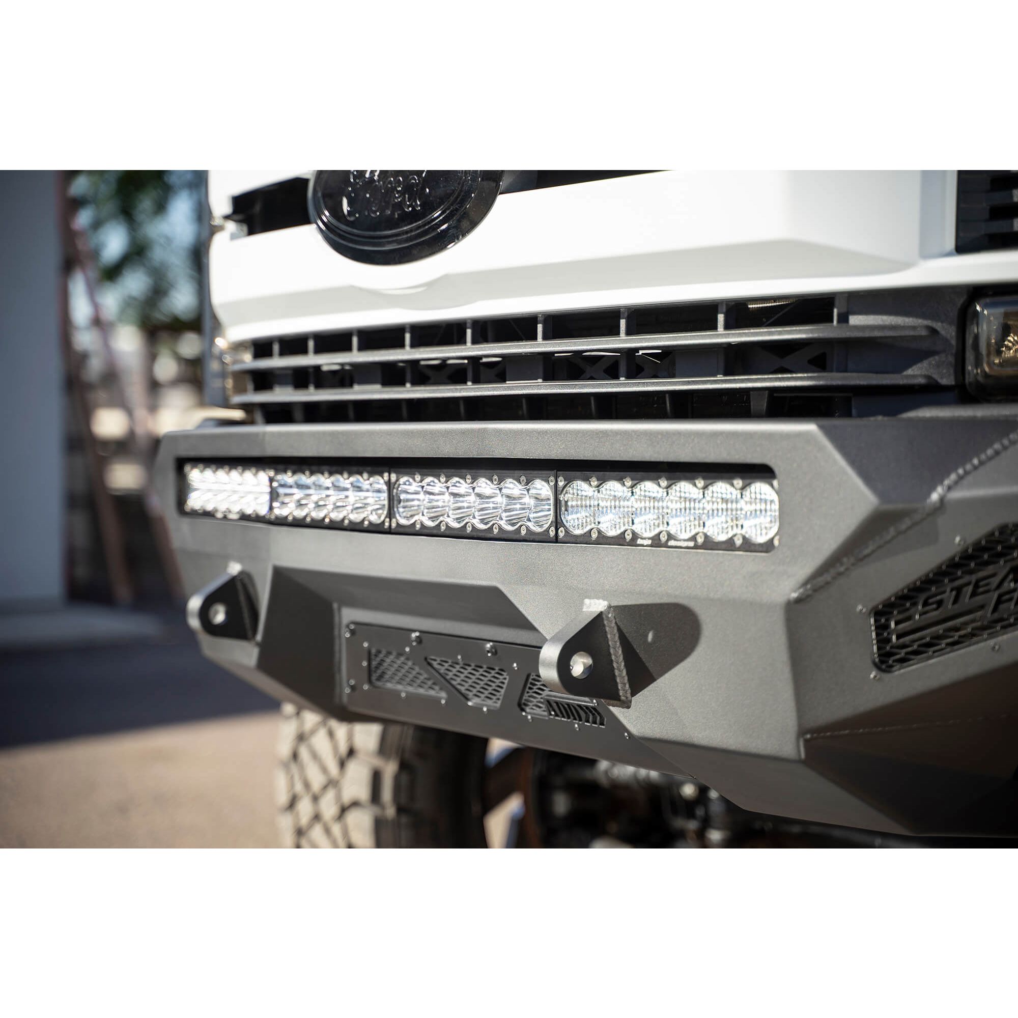 The Ford Super Duty has never looked better with the Stealth Fighter front bumper. A radius plate steel design gives your Super Duty added front end protection without all the extra bulk. Matching the factory body lines, the Stealth Fighter front bumper is a tight fitting steel plate bumper that truly compliments Ford's OEM look. Our patented universal light mount system allows the use of up to a 40" radius LED bar or 10 cube lights in the center of the bumper. Mount any combination of brand, size, and style light to give your Super Duty the added lighting you need. Fully bolt-on means that no cutting or welding is required for installation. Reinforced D-ring and winch mounts provide your truck with added utility to pull through any tough situation.