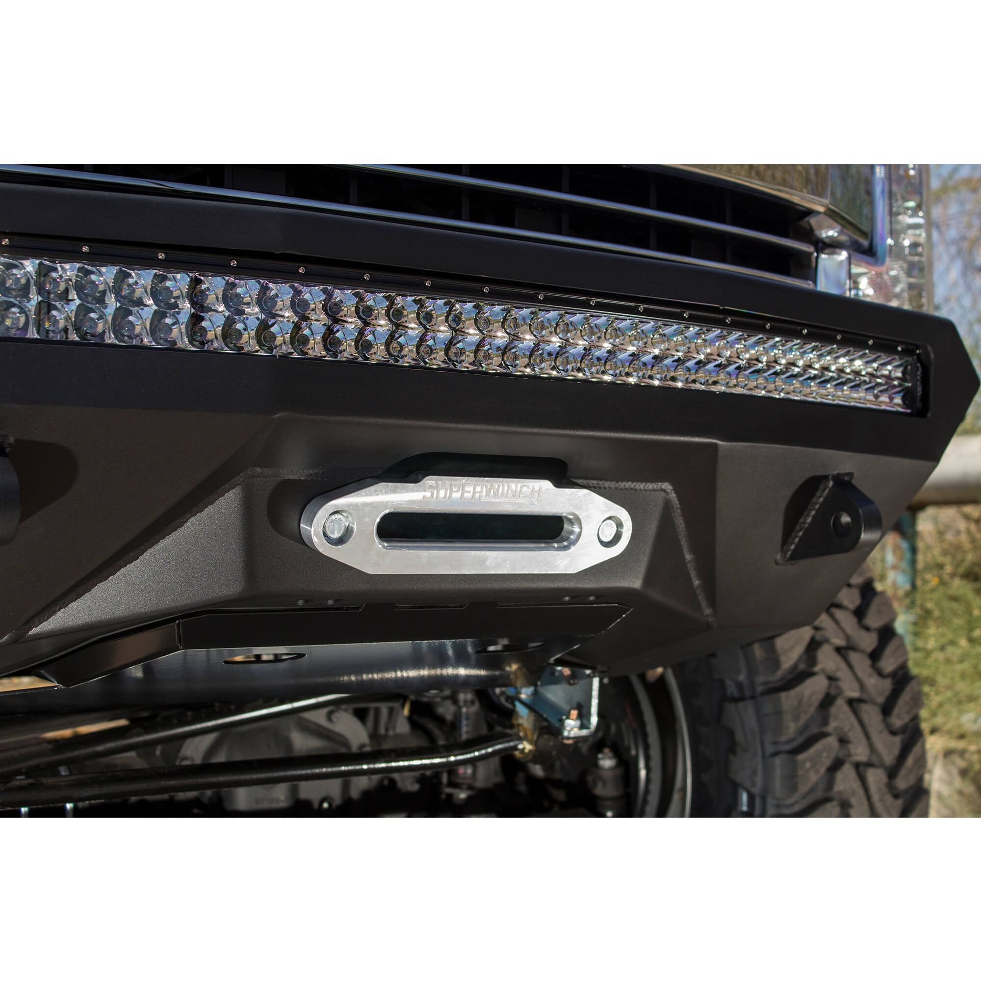 The Ford F-250/F-350 has never looked better with the Stealth Fighter front bumper. A radius plate steel design gives your Super Duty added front end protection without all the extra bulk. Matching the factory body lines, the Stealth Fighter front bumper is a tight fitting steel plate bumper that truly compliments Ford's OEM look. Our patented universal light mount system allows the use of up to a 40" radius LED bar or 10 cube lights in the center of the bumper. Mount any combination of brand, size, and style light to give your Super Duty the added lighting you need. Fully bolt-on means that no cutting or welding is required for installation. Reinforced D-ring and winch mounts provide your truck with added utility to pull through any tough situation.