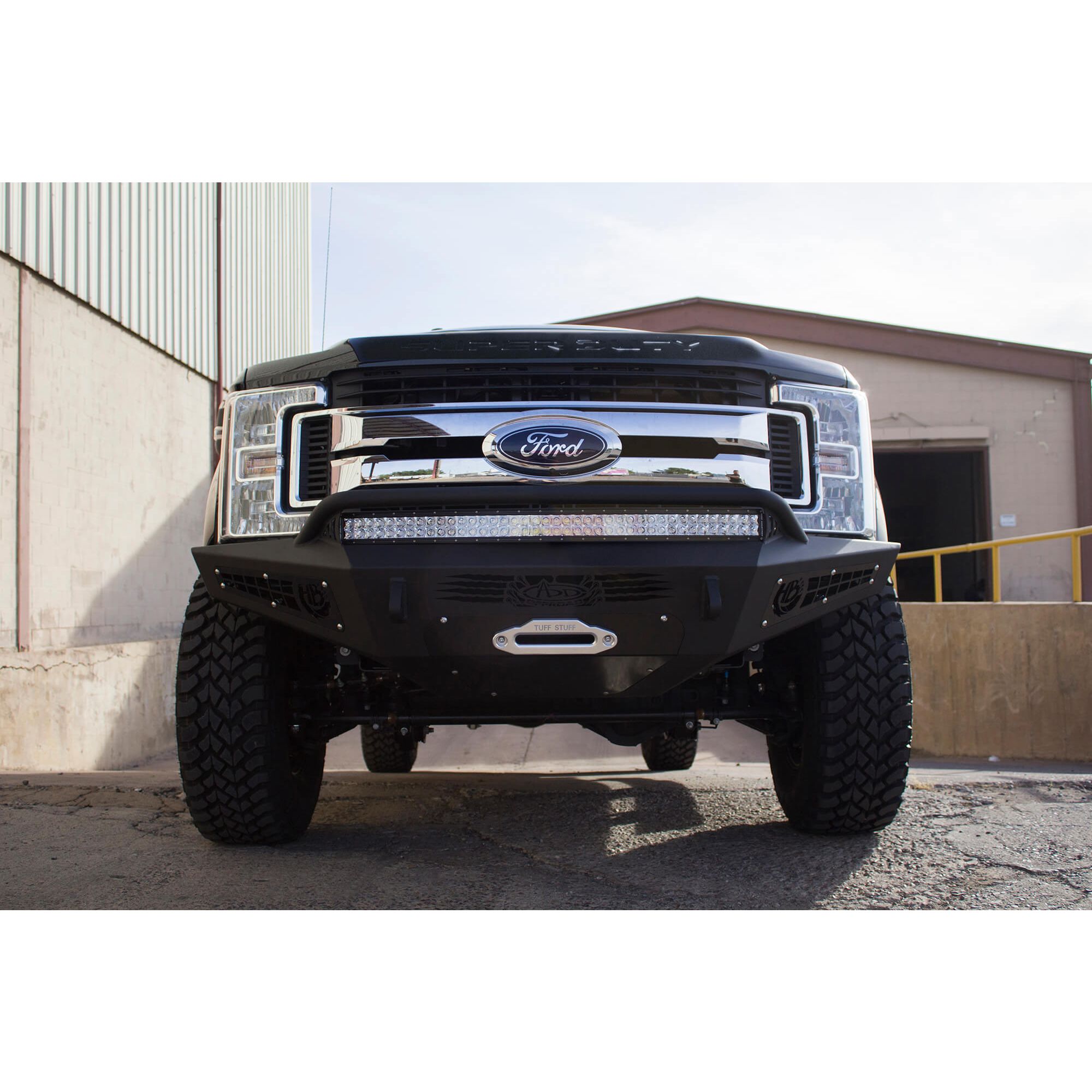 Ford F250 2017 – up HoneyBadgerFrontBumper with Winch Mounts with HB logo cutout and 10 dually mounts/universal plate on top and 20" Universal LED bar mounts in center and 10" SR mounts in side panels in Hammer Black and Satin Black Panels
