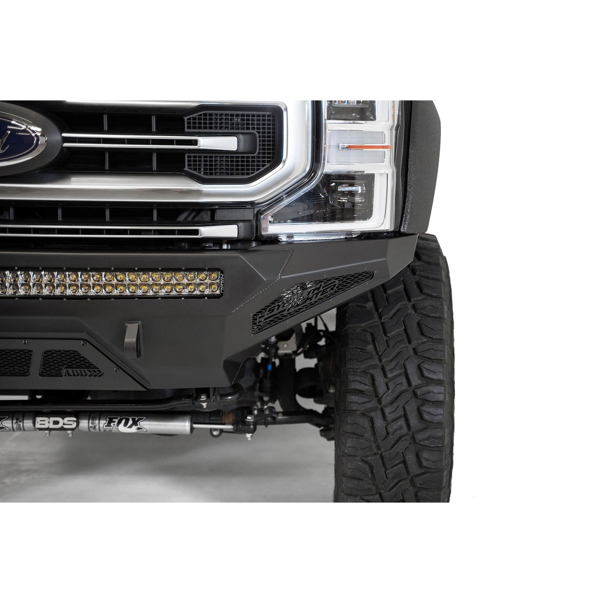 The Ford Super Duty has never looked better with the Stealth Fighter front bumper. A radius plate steel design gives your Super Duty added front end protection without all the extra bulk. Matching the factory body lines, the Stealth Fighter front bumper is a tight fitting steel plate bumper that truly compliments Ford's OEM look. Our patented universal light mount system allows the use of up to a 40" radius LED bar or 10 cube lights in the center of the bumper. Mount any combination of brand, size, and style light to give your Super Duty the added lighting you need. Fully bolt-on means that no cutting or welding is required for installation. Reinforced D-ring and winch mounts provide your truck with added utility to pull through any tough situation.