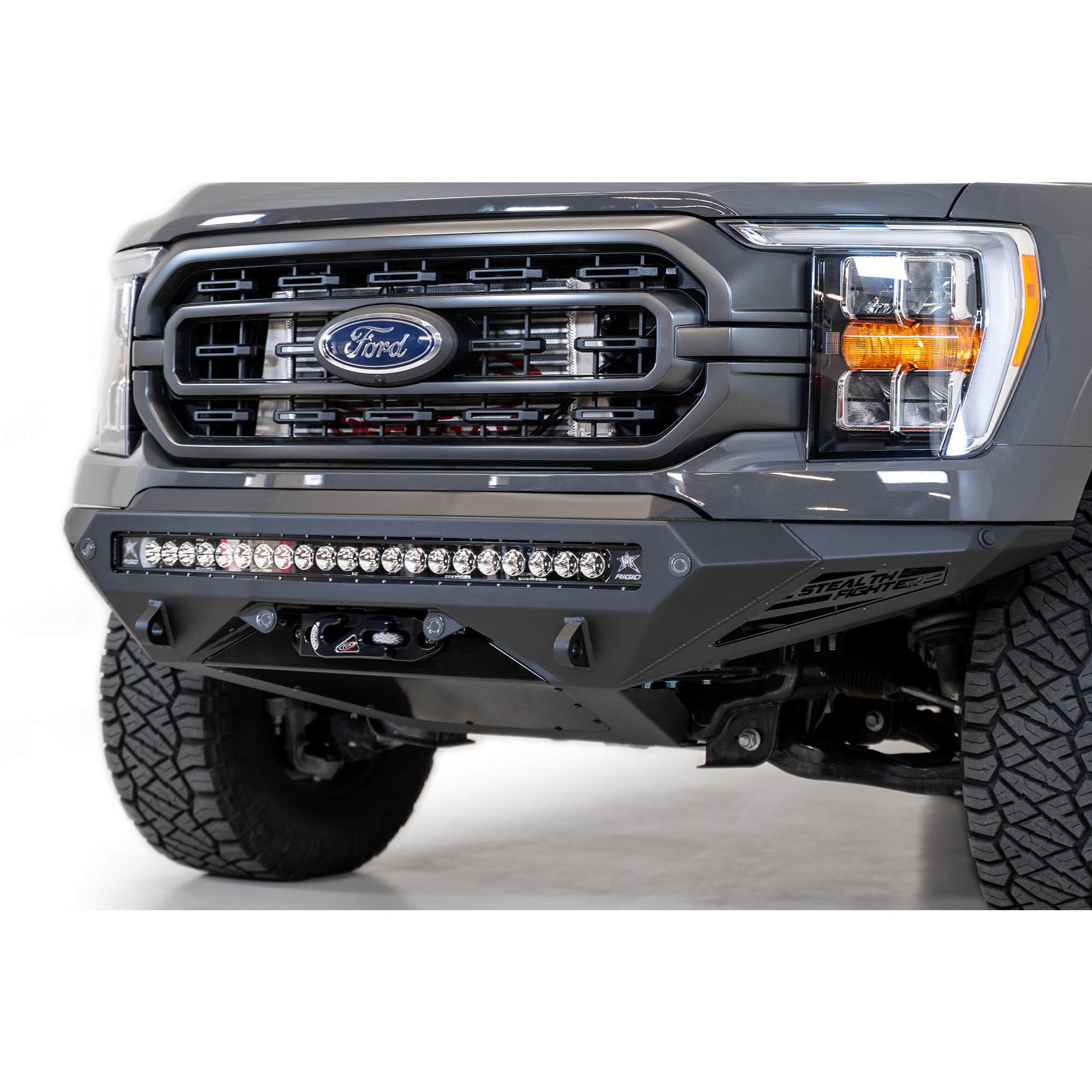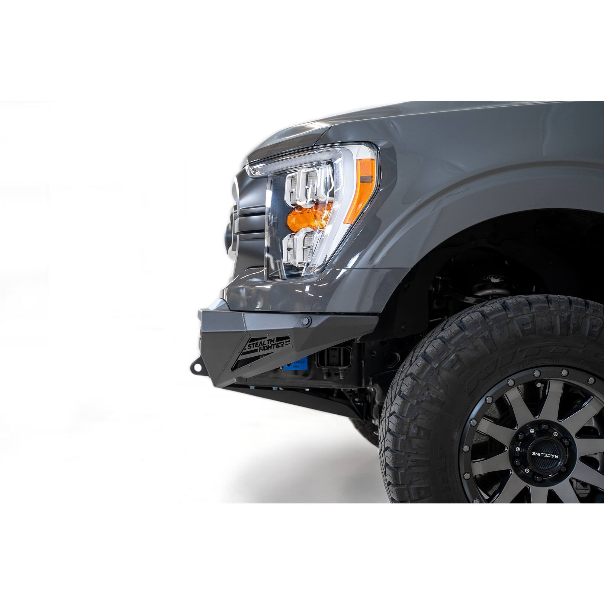 Ford F150 Stealth Fighter Winch Front Bumper with 10 Cube Mounts/Universal Plate on op and 10" SR/Cube Mounts on Sides with SENSOR Cutouts with D-ring Mounts in Hammer Black with Satin Black panels