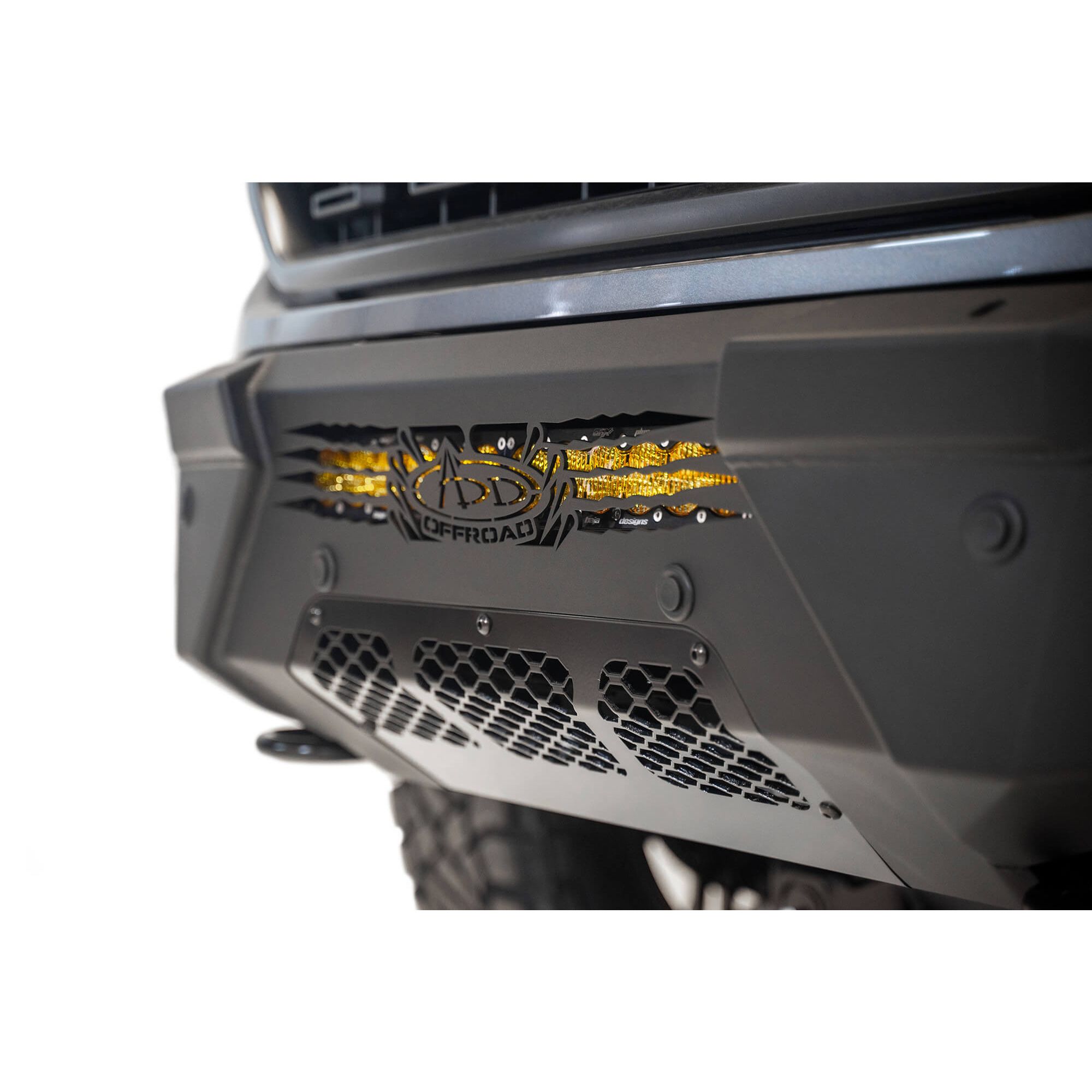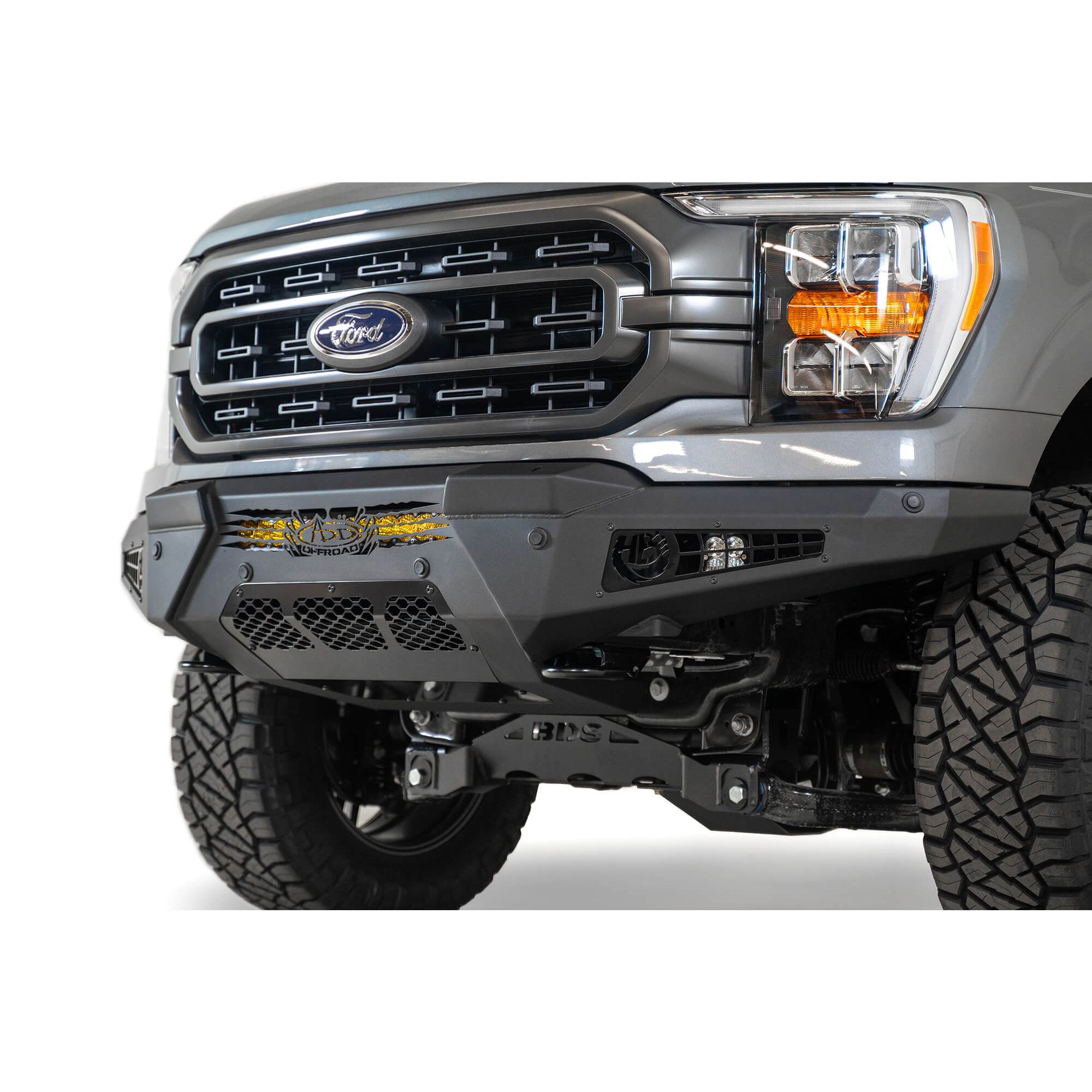 The newly redesigned Addictive Desert Designs HoneyBadger Front Bumper keeps the same rugged styling as the original but with a low-profile fitment. There is an optional top hoop, but either configuration has room to mount a radius 30" light bar on top of the bumper. The center of the bumper houses a straight 20" light bar, and two cube lights can be mounted behind the side panels. The HoneyBadger comes in hammer black powder coat with satin black panels. OEM amenities, such as parking sensors and tow hooks, are retained. Even though it is an aftermarket front bumper, the HoneyBadger follows the bodylines perfectly, making the front of your F-150 look unique without sacrificing quality. As always this product is fully bolt-on and made in America.