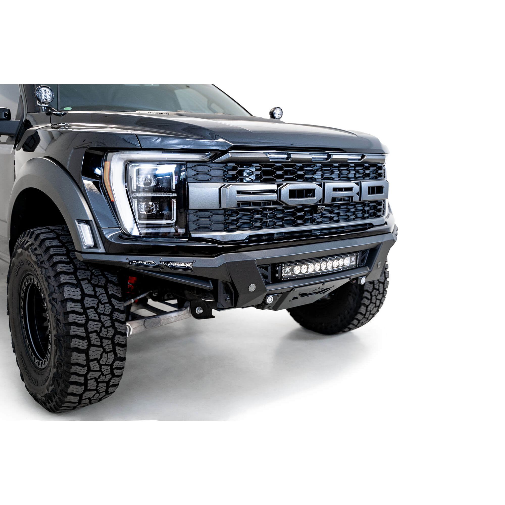 Introducing the new Phantom line of ADD bumpers. This low-profile 3rd gen Raptor front bumper features a prerunner inspired layout. The Phantom is constructed from plate steel for a more enhanced style, rather than the traditional tube steel. Its knife's edge design was intended to mimic the look of trailing arms. A lightweight 3/16-inch aluminum skid plate provides full protection without adding excess weight. The skid also features vented cutouts for proper intercooler air flow. The Phantom has several lighting options, including a central 20-inch radius light bar mount and 10-inch SR light mounts behind each side panel. The bumper features sensor mounts in order to retain full functionality of the parking sensors. An Adaptive Cruise Control relocation bracket is required for installation, however the intercooler does not need to be moved for proper fitment. As always, this is fully bolt-on and Made in America.