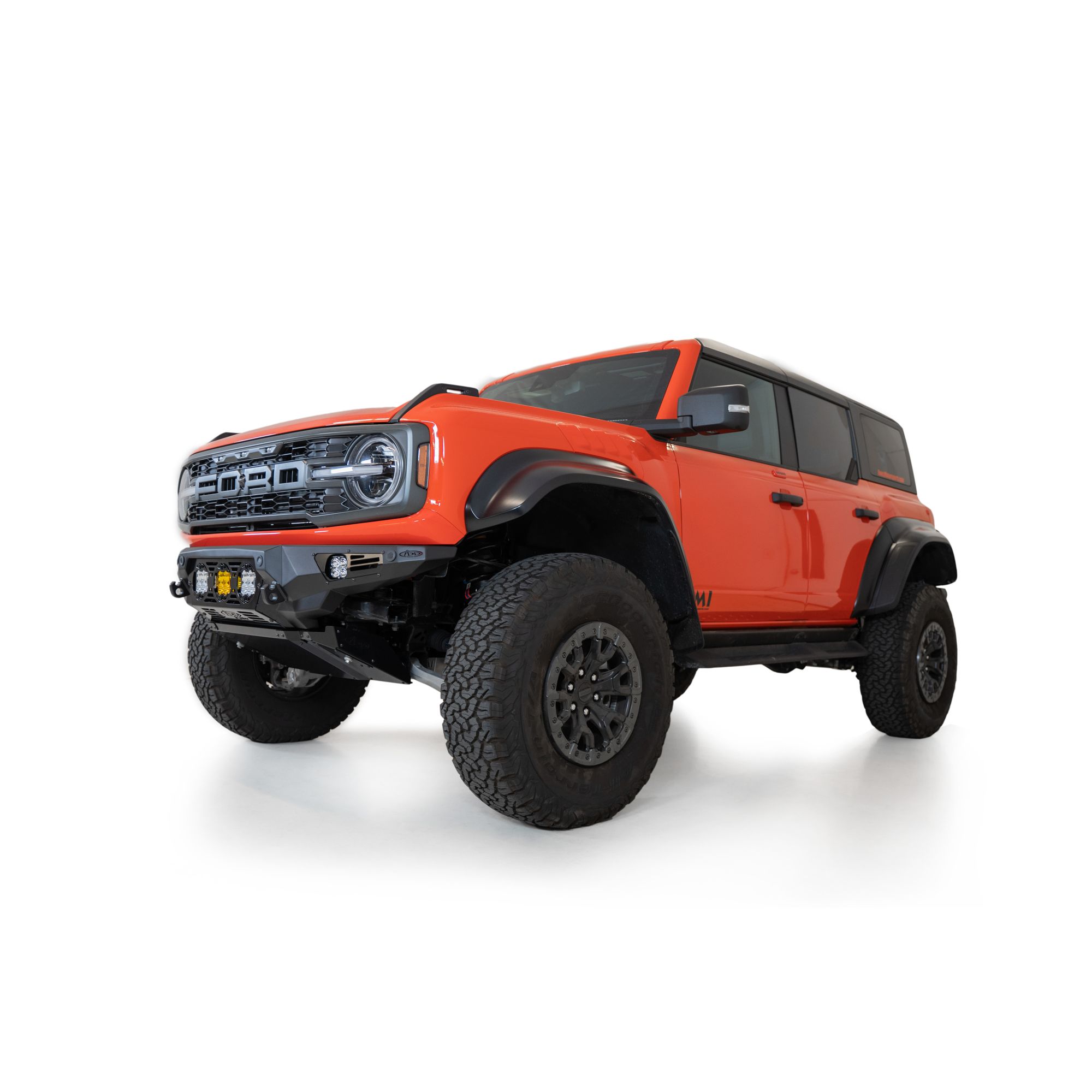 Ford Bronco Raptor 2022 – up Bomber Front Bumper 3 Baja Designs LP4 Mounts and Dually Mounts on Sides in Hammer Black with Satin Black panels