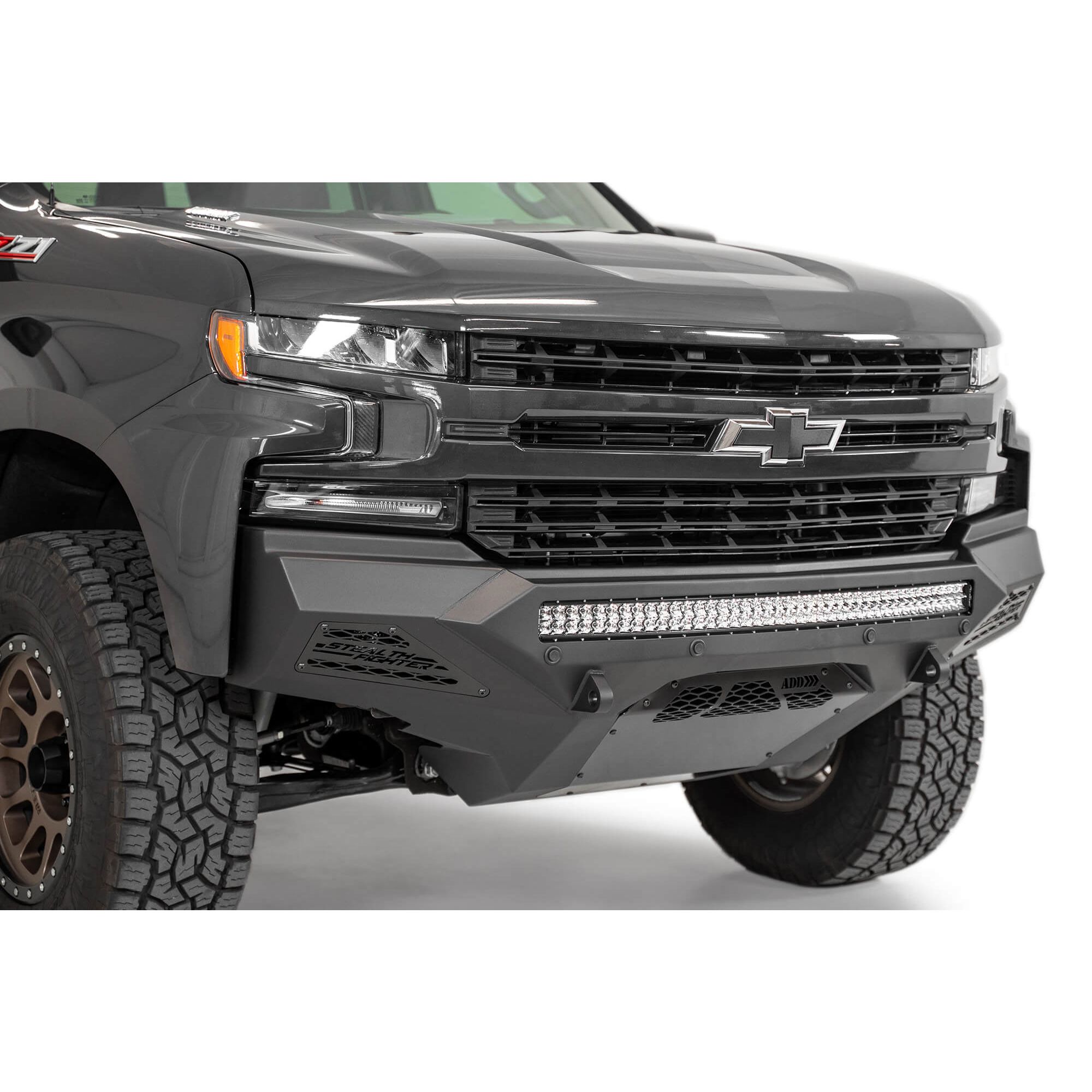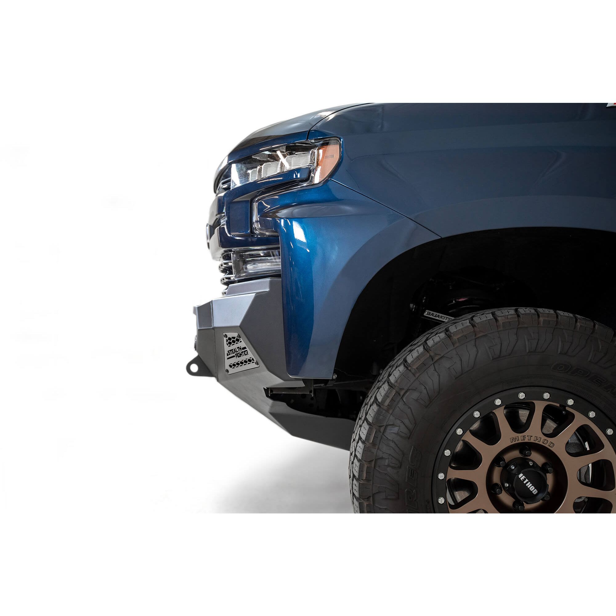 The Chevy Silverado 1500 has never looked better than with the Stealth Fighter front bumper. A radius plate steel design gives your Silverado added front end protection without all the extra bulk. Matching the Chevy 1500 body lines, the Stealth Fighter is a tight fitting bumper that compliments the Silverado's look. Our patented universal light mount system allows mounting up to 10 cube lights or a 40" radius light bar in the center of the bumper. Mount any combination of brand, size, and style light to give your Chevy the added lighting you need. Additional lighting mounts a single cube light behind each side panel. Fully bolt-on means that there is no cutting or welding required to install the Stealth Fighter front bumper. Designed to keep the factory air dams and comes with optional sensor cutouts to retain OEM features. Reinforced D-Ring mounts and optional winch mount provide your truck with added utility to pull through any tough situation.