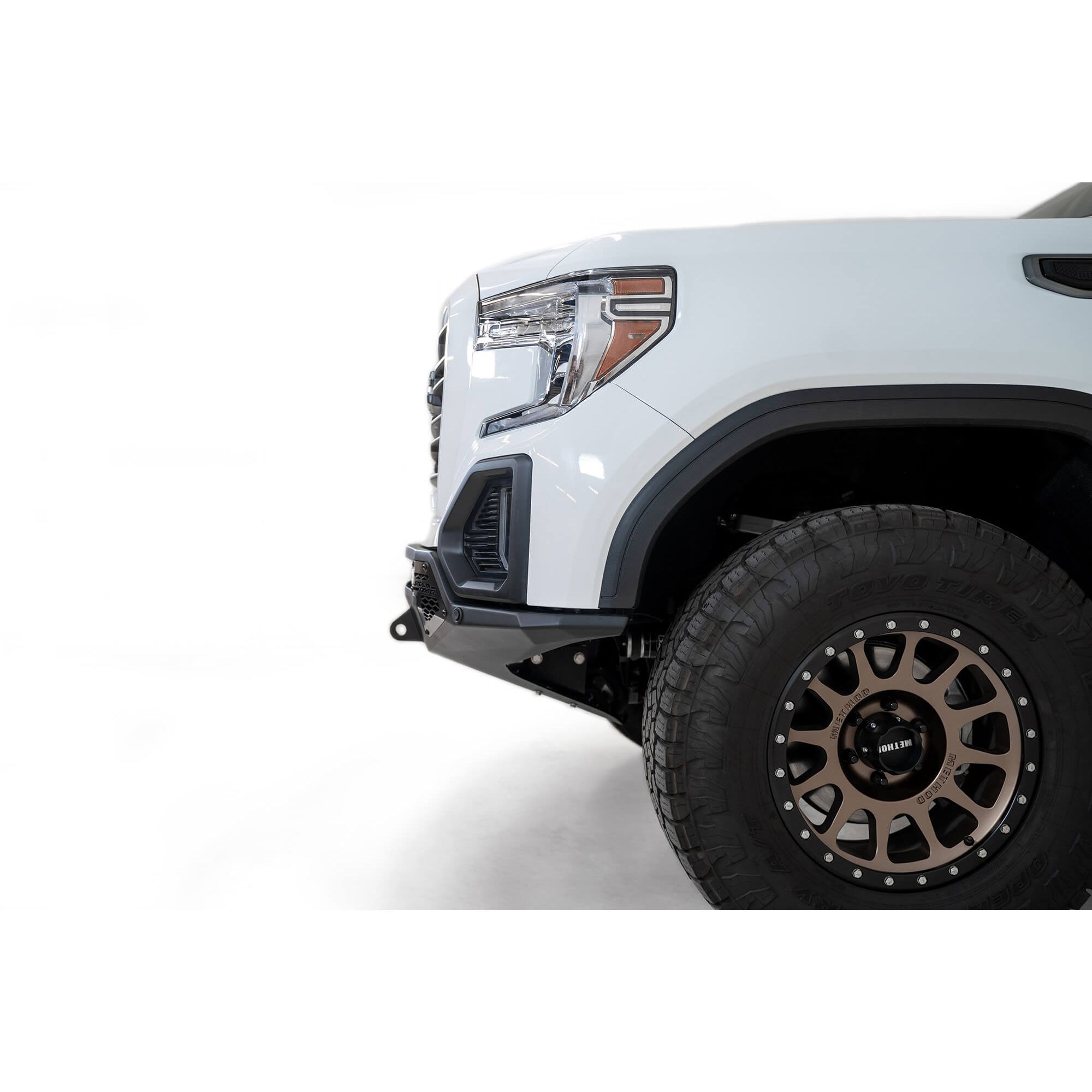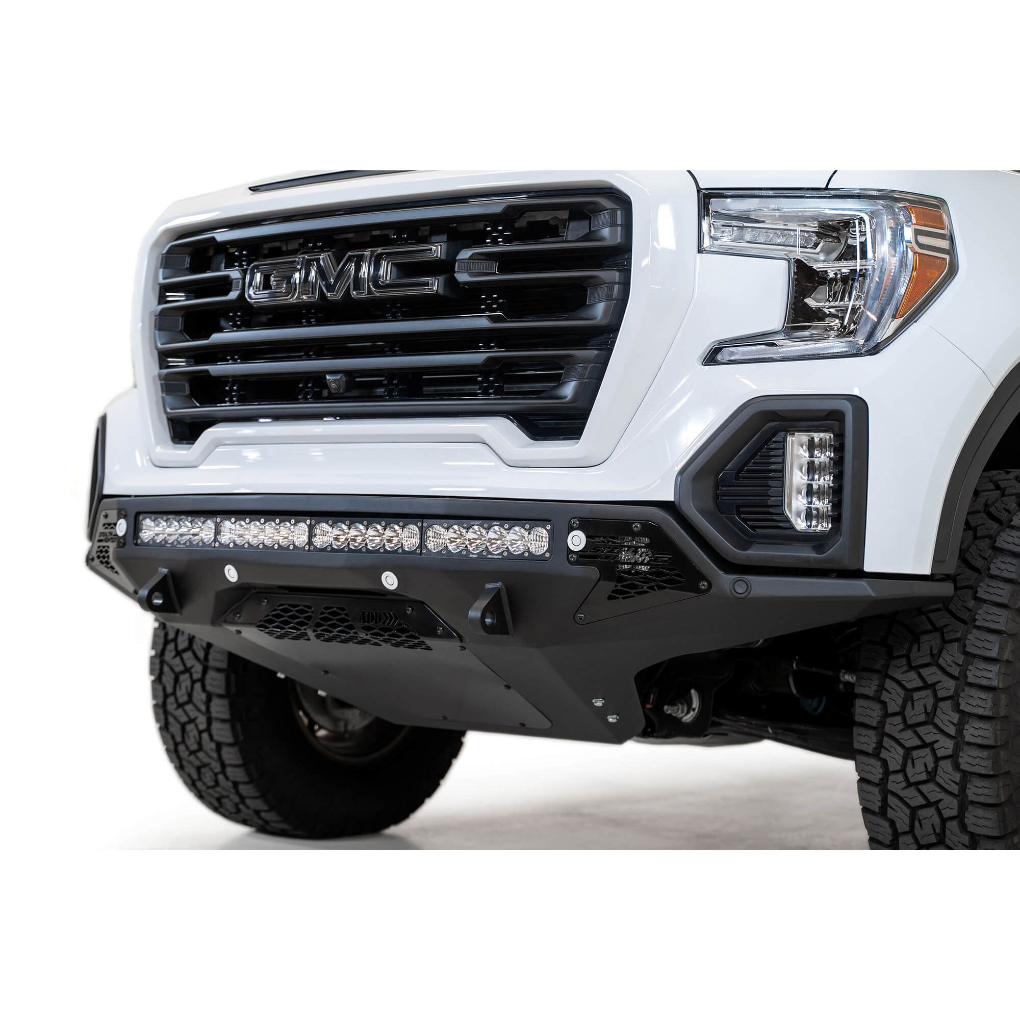 The GMC Sierra 1500 has never looked better with the Stealth Fighter front bumper. A radius plate steel design gives your GMC Sierra added front end protection without all the extra bulk. Matching the GMC 1500 body lines, the Stealth Fighter is a tight fitting bumper that compliments the GMC's look. Our patented universal light mount system allows mounting up to 10 cube lights or a 40" radius light bar in the center of the bumper. Mount any combination of brand, size, and style light to give your GMC the added lighting you need. Additional lighting mounts a single cube light behind each side panel. Fully bolt-on means that there is no cutting or welding required to install the Stealth Fighter front bumper. It is designed to keep the factory fog lights and comes with sensor cutouts to retain OEM features. Venting in your skid plate allows proper airflow to the intercooler found on diesel models. Reinforced D-Ring mounts and optional winch mount provide your truck with added utility to pull through any tough situation.
